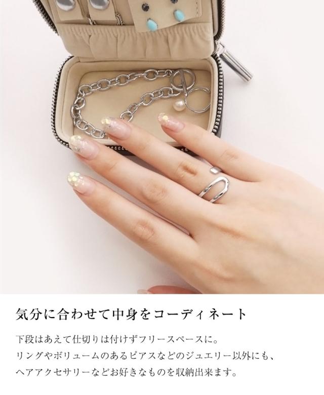 ピアスを2ペア収納できるホルダーや、ネックレス・ブレスレット用のスペース、 さらに大ぶりのジュエリーも収まるフリースペースを備え、機能性も充実しています。