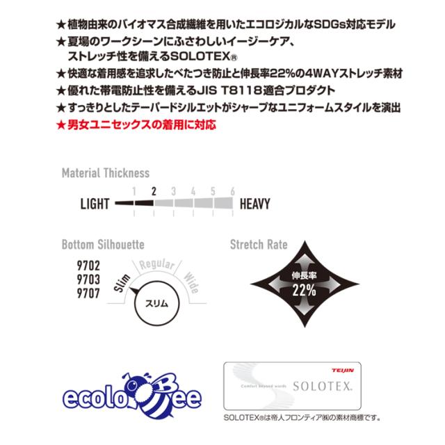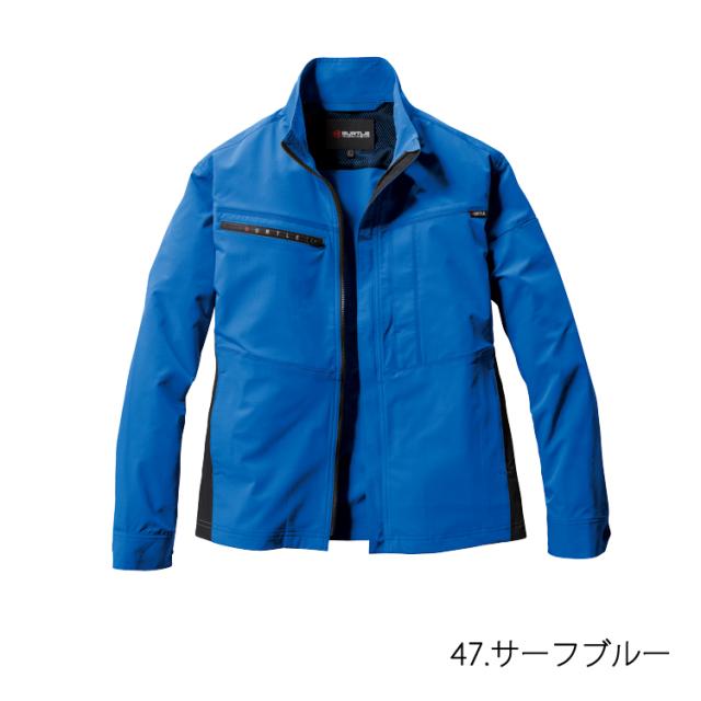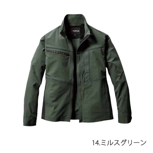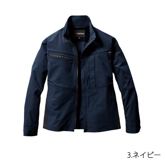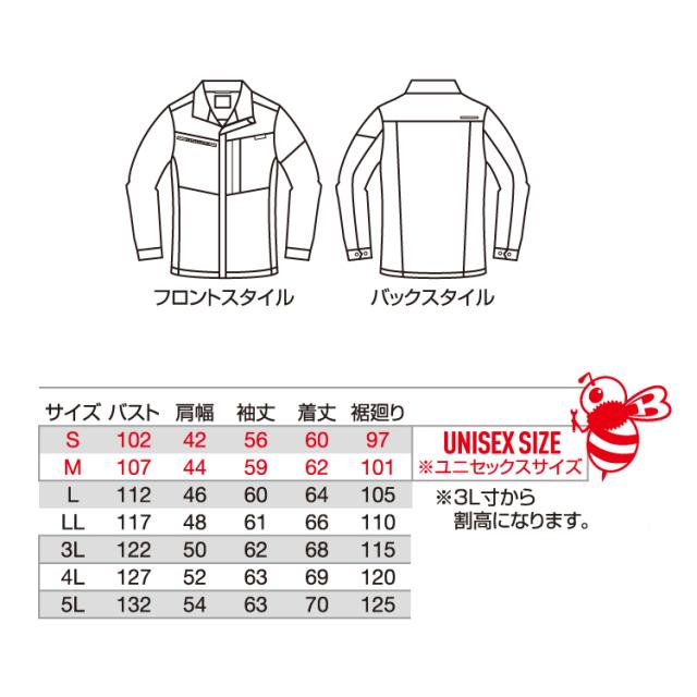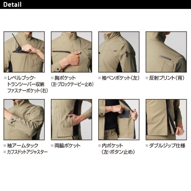 男女兼用、リサイクル、制電ケア、ストレッチ、吸汗速乾 レベルブック・トランシーバー収納ファスナーポケット(右)、胸ポケット(左・ブロックテーピー止め)、袖ペンポケット(左)、 反射プリント(背)、袖アームタック、カフストッドアジャスター、両脇ポケット、内ポケット(左・ボタン止め)、 ダブルジップ仕様