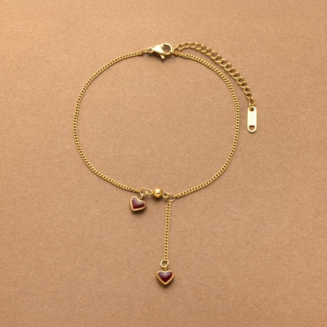ぷっくりとしたダブルハートが大人可愛いアンクレット。シックなレッドブラウンの色味と小ぶりなサイジングで甘さ控えめなモチーフ。錆びにくく傷に強いステンレス製で、長時間の着用も安心の低アレルギー素材です。