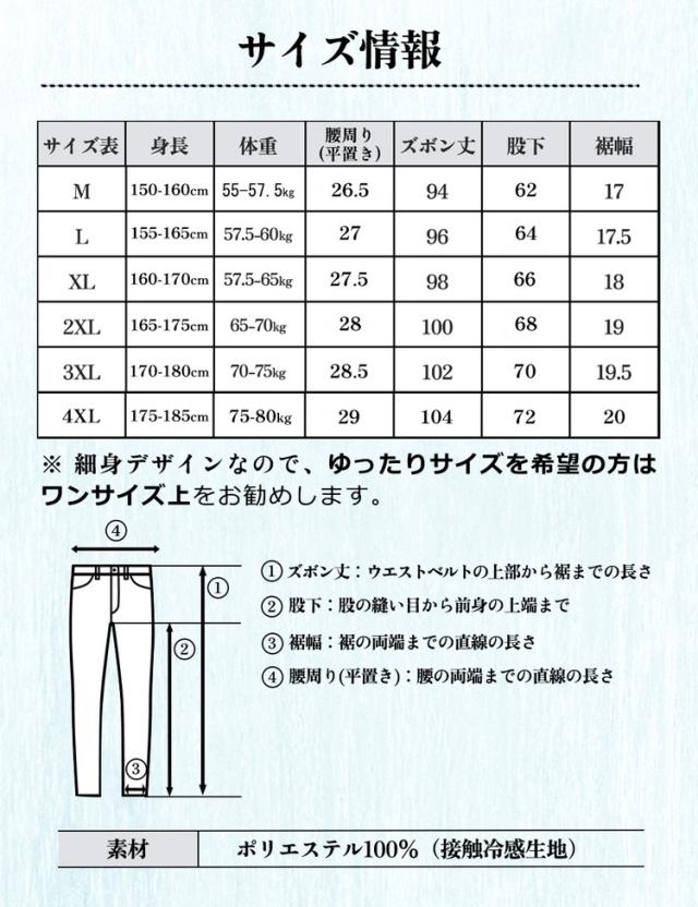 4XL:おすすめ身長(約)175〜185cm、おすすめ体重(約)75〜80kg、腰周り(平置き) (約)29cm、ズボン丈(約)104cm、股下(約)72cm、裾幅(約)20cm