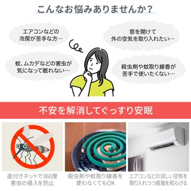 底付きで布団をすっぽり包めるので、蚊やムカデなどの害虫が入ってきません。