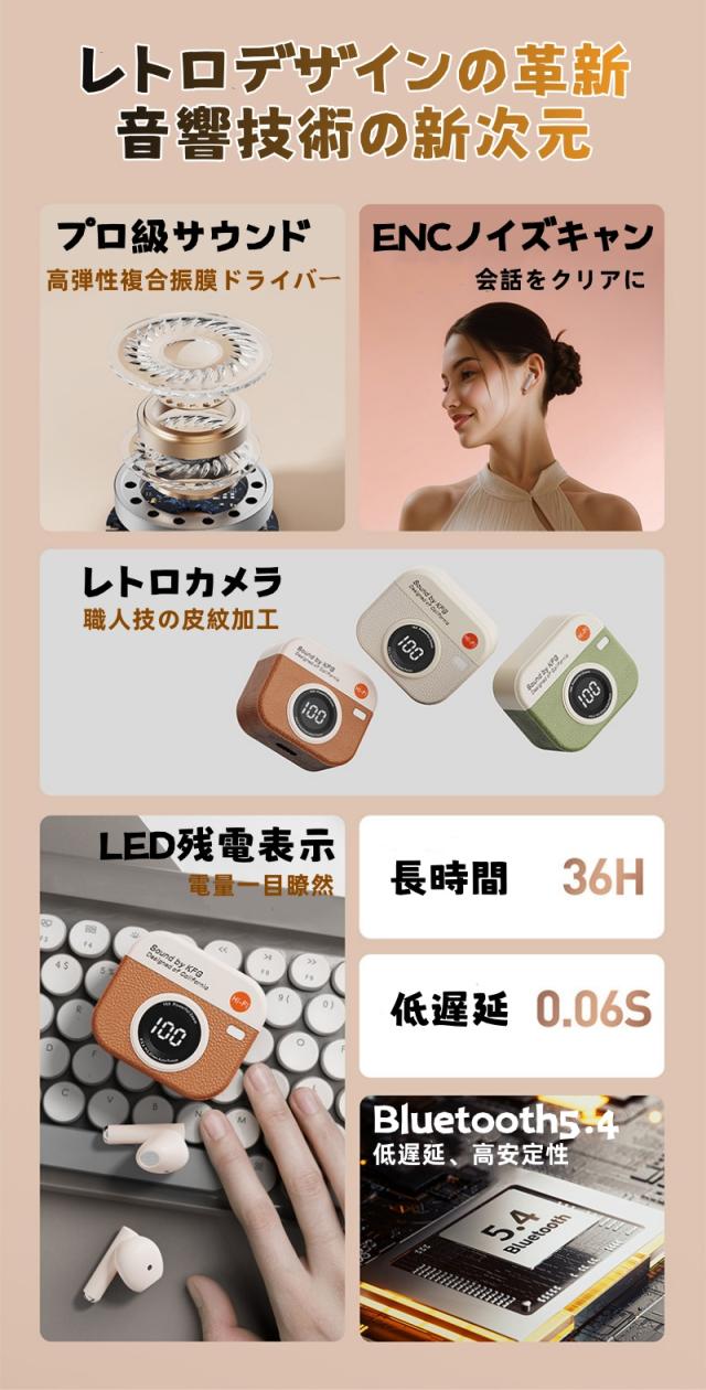 ワイヤレスイヤホン Bluetooth5.4 圧迫感ゼロ イヤホン 高音質 led表示 ブルートゥース 小型 軽量 片耳 両耳 ios ENCノイズキャンセリング レトロカメラ ギフト