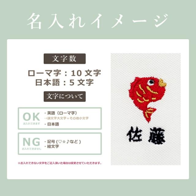 縁起物 刺繍ポロシャツ 誕生日プレゼントや還暦祝いなど、さまざまなギフトにおすすめ。 おしゃれでかわいい刺繍ポロシャツ。 オーダーをいただいてからひとつずつ丁寧に。 お好きなワンポイントとお名前を刺繍します。 名入れ専門店だからできる高級感のある仕上がり。 しっかりした厚みの鹿の子編みコットンポロシャツは、 スポーツやプライベートなど、様々なシーンで大活躍! ドライ素材と比べて、高級感ある素材になっています。 春〜秋まで長いシーズンご着用いただけます。 《縁起物でご利益アップ!?》 それぞれのモチーフの持つ意味にあわせて、おすきなものをセレクトしてくださいね。 ★だるま 願いをかなえる・商売繁盛、魔よけ・家内安全など ★こけし 心身回復・五穀豊穣・厄除け・子授けなど ★鯛 還暦祝いや古希などお祝いごとに・長寿・魔除けなど ★招き猫 金運上昇・開運・全体的な運気向上など ●名入れのカラー ホワイト/ブラック/ネイビー/レッド/グリーン ※ご注意※ ポロシャツと同じカラーですと名入れがほとんど目立たなくなってしまいます。 ●ポロシャツのカラーは全4色 ホワイト/ネイビー/グレー/ブラック/ ■サイズ:男女兼用 M/L/XL (サイズ表をご覧ください) ■素材:綿 100% 鹿の子(グレー:綿 90%、レーヨン 10%) ■原産国:ベトナム 《名入れについて》 文字: ローマ字(頭文字大文字+その他小文字) 日本語 文字数: ローマ字10文字まで 日本語5文字まで ※上記以外の形式でご記入いただいた場合は、当店で変更をさせていただきます。 ご了承のほどお願いいたします。 |