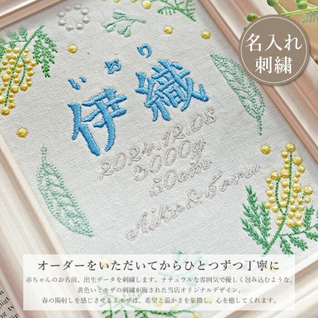 命名書 刺繍 オーダー おしゃれ かわいい 命名札 ミモザブルー 出生データ 名前旗 名前札 命名 初節句 七五三 お食い初め お宮参り お七夜 ひな祭り 出産祝い 百日祝い 初誕生