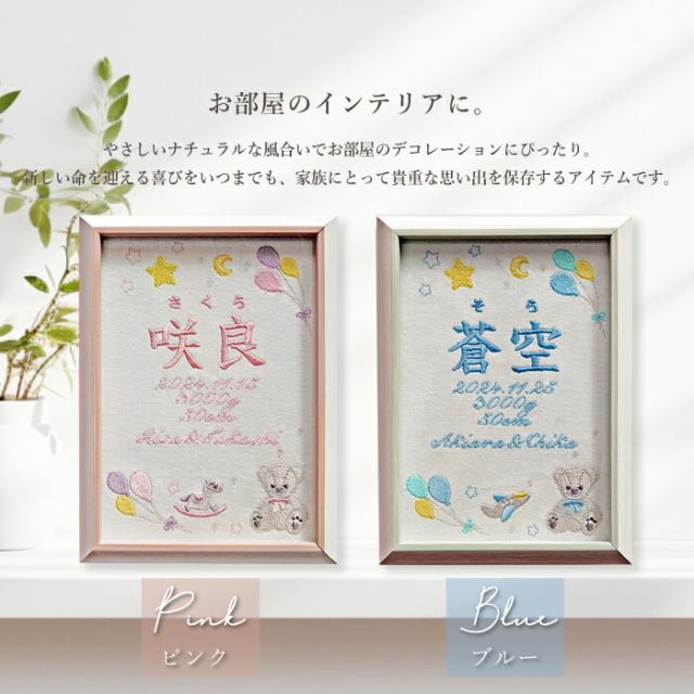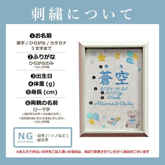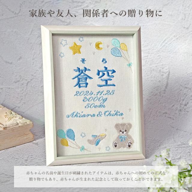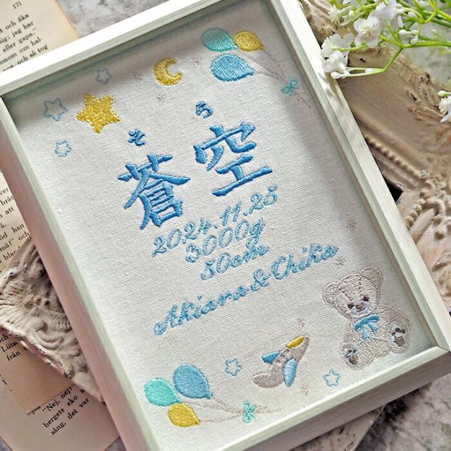 「命名書」とは 命名書とは、赤ちゃんが生まれた際に赤ちゃんの名前や生年月日などを記載した伝統的なアイテムです。 赤ちゃんが生まれてから7日目の夜に行われるお七夜で、 祖先神に対して赤ちゃんの誕生を報告する「命名式」の際に使用されます。 《オーダーをいただいてからひとつずつ丁寧に》 赤ちゃんのお名前、生年月日、出生データを刺繍します。 愛らしいテディベアのぬいぐるみやバルーンのデザインが赤ちゃんの誕生をお祝いします。 細部にこだわった繊細な刺しゅうは、柔らかくて温かみのある雰囲気を作り出します。 《家族や友人、関係者への贈り物に》 赤ちゃんの名前や誕生日が刺繍されたアイテムは、赤ちゃんへの初めての正式な贈り物でもあり、 赤ちゃんが生まれた記念として取っておくことができます。 《お部屋のインテリアに》 やさしいナチュラルな風合いでお部屋のデコレーションにぴったり。 新しい命を迎える喜びをいつまでも、家族にとって貴重な思い出を保存するアイテムです。 《選べるカラー》 ブルー、ピンクの2種類(カラー毎にページをご用意しております) 《おしゃれなギフトBOX入り》 クラフト素材がおしゃれなギフトボックスに入れてお届け。 大切な日のギフトに、特別感を演出します。 ■飾り方いろいろ 背面にはスタンドのほかに壁掛け金具付きで壁にかけて飾ることも可能です。 ■サイズ 命名書フレーム:149×200mm ギフトBOX:184×230×35mm ■素材・成分: 生地:コットンリネン フレーム:ポリスチレン -------- 【刺繍する文字について】 1.お名前: 漢字、ひらがな、カタカナ *字数3文字まで 2.ふりがな:ひらがなのみ *なしも可能 3.出生日 4.体重(g) 5.身長(cm) 6.両親の名前 ローマ字(頭文字大文字+その他小文字) *なしも可能 《NG》記号、絵文字など ※お入れできない文字をご記入頂いた場合は、当店で変更させていただく場合がございます -------- |