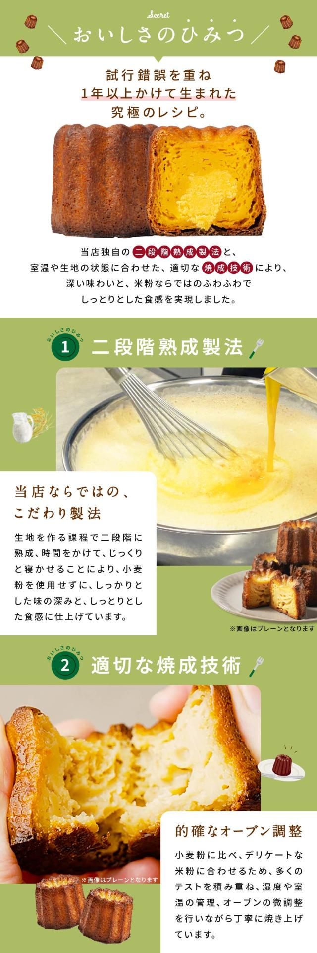 | 商品説明 | 北海道二段階熟成カヌレに『米粉のカヌレ』が登場! 小麦粉を使わないグルテンフリー食品ながら『米粉のカヌレ』は「二段階熟成技術」により、カヌレ本来のおいしさを実現しています。 小麦アレルギーのお子様も安心しておいしく食べられる新しいスイーツです。 小麦粉不使用・ラム酒不使用、保存料等の添加物等も使用しておりません。 甘味には「てんさい糖」を使用して、やさしい甘みに仕上げました。 そして、北海道産のかぼちゃを生地に使用しています。 パティシエがこだわり抜いた『米粉のカヌレ』、是非一度お試しください。 |