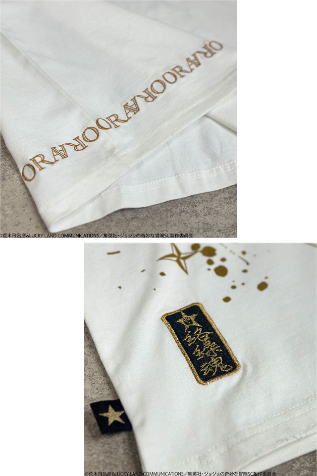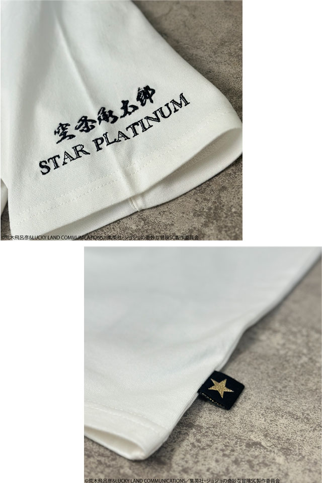 超人気のJOJOコラボに第三部主人公【空条承太郎】がTシャツとなって登場!! 承太郎はもちろん、スタンド【スタープラチナ】を刺繍!! ピスネームはT シャツ限定のデザインを新規企画。 ジョースター家の血筋の証である左肩の星型のアザを入れた、ジョジョ好きがジョジョ好きの為に作成した最高の一着!! | |||||||||||||||||||||||||