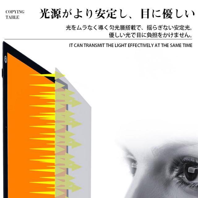 LEDライトを多く搭載し高輝度を実現。ドットなしの高品質パネルによる全面発光で、均等な明るさとちらつきを軽減した快適な作業環境を提供 ボタンの長押しで無段階調整ができるので、用紙の厚さに応じ明度調整可。
