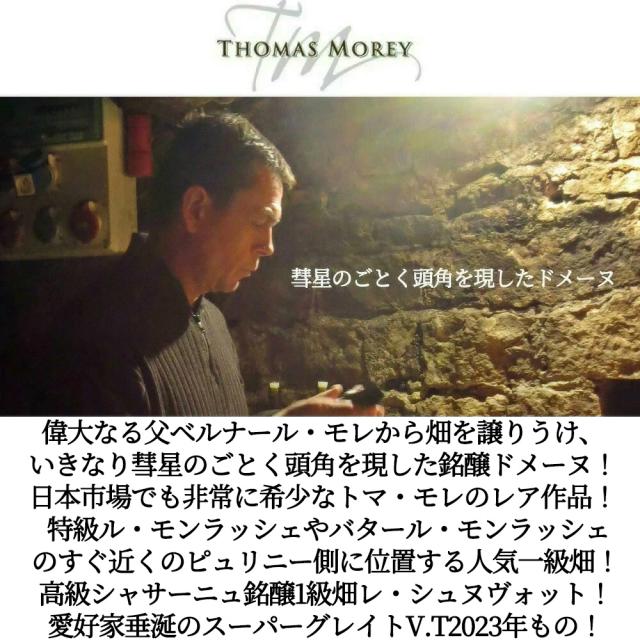 偉大なる父ベルナール・モレから畑を譲りうけ、いきなり彗星のごとく頭角を現した銘醸ドメーヌ!日本市場でも非常に希少なトマ・モレのレア作品! 特級ル・モンラッシェやバタール・モンラッシェ のすぐ近くのピュリニー側に位置する人気一級畑! 高級シャサーニュ銘醸1級畑レ・シュヌヴォット! 愛好家垂涎のスーパーグレイトV.T2023年もの!