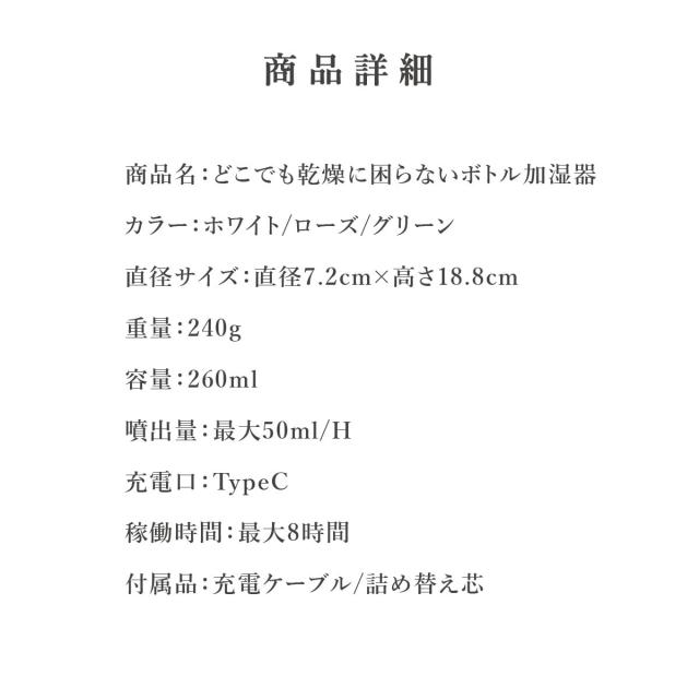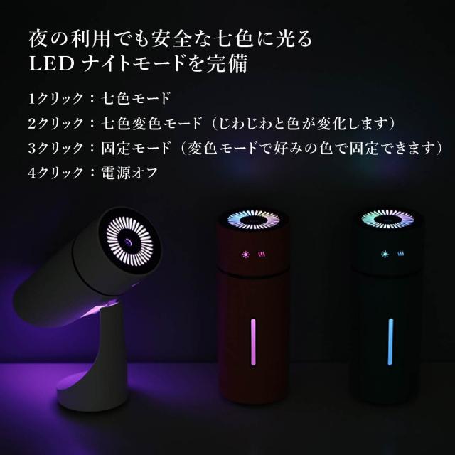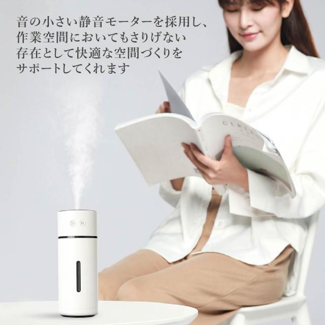 ?特徴:オフィスで使えるコードレスの卓上小型加湿器。自由に角度が変えられるので、斜めにしたりすることでお好みの位置に心地よいミストを送り届けることができます。オフィスでのデスクやリビングの机、寝室や車内などどこにでも持ち運べるコンパクトなデザインが の加湿器です。水筒を洗うように手入れが楽なので、いつでも衛生的に使用することができます。付属の替え芯も付いているのもおすすめです。