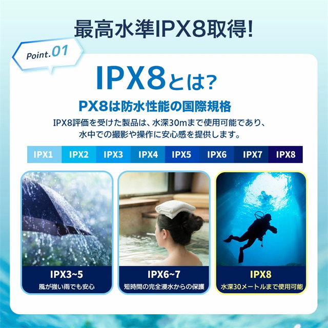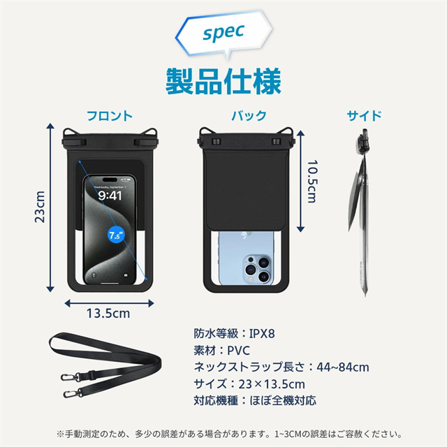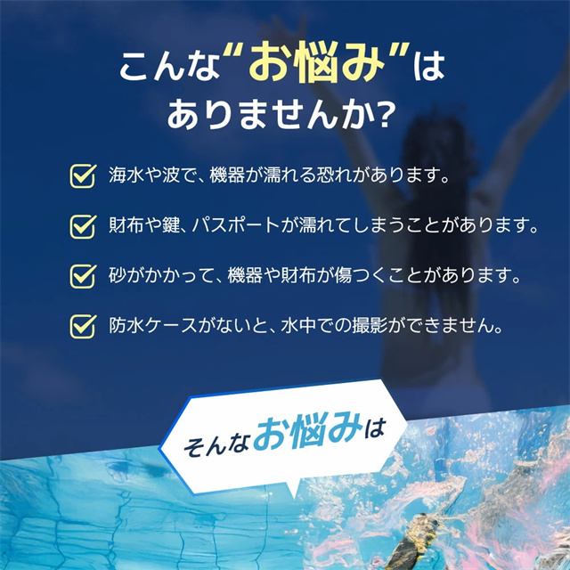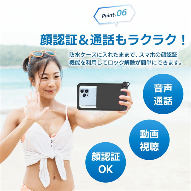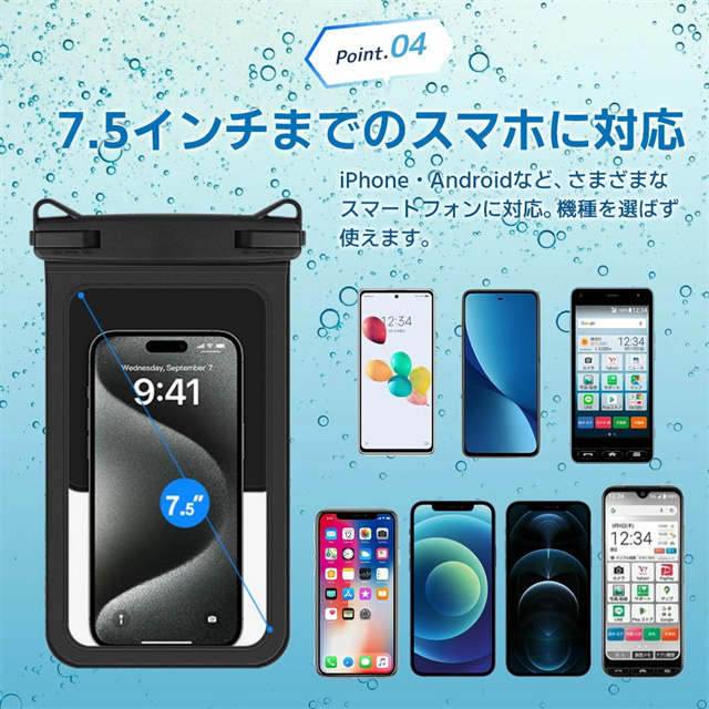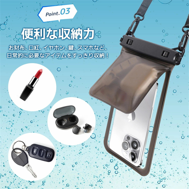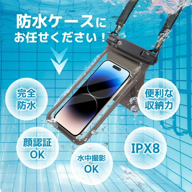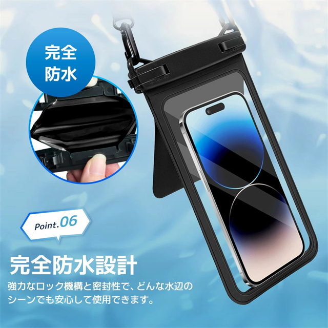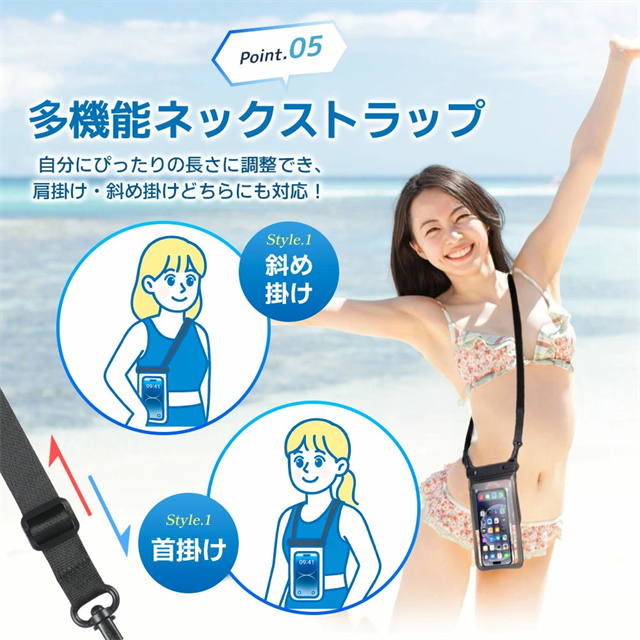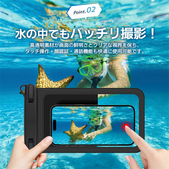 【IPX8認証!完全防水】 水深30mまで対応できる防水性能で、海・プール・お風呂・アウトドア・通勤通学まで幅広く活躍。大切なスマホをしっかり守ります。 【水中撮影&タッチ操作対応】 高透明素材で水中撮影もバッチリ!タッチ操作や顔認証、通話もケースに入れたまま快適に。 【ダブル収納ポケット搭載】 スマホ+鍵や小物もすっきり収納できる便利なダブルポケット設計。アウトドア・旅行・海水浴にぴったり! 【7.5インチ対応&多機能ストラップ】 iPhone・Androidなど7.5インチまで対応。長さ調整可能なネックストラップ付きで首掛けも斜め掛けもOK! 【お風呂からアウトドアまで大活躍】 防水ケース お風呂 スマホ・海・アウトドア・フェスなど様々なシーンで大活躍。通勤通学・旅行でも大変便利です。 |