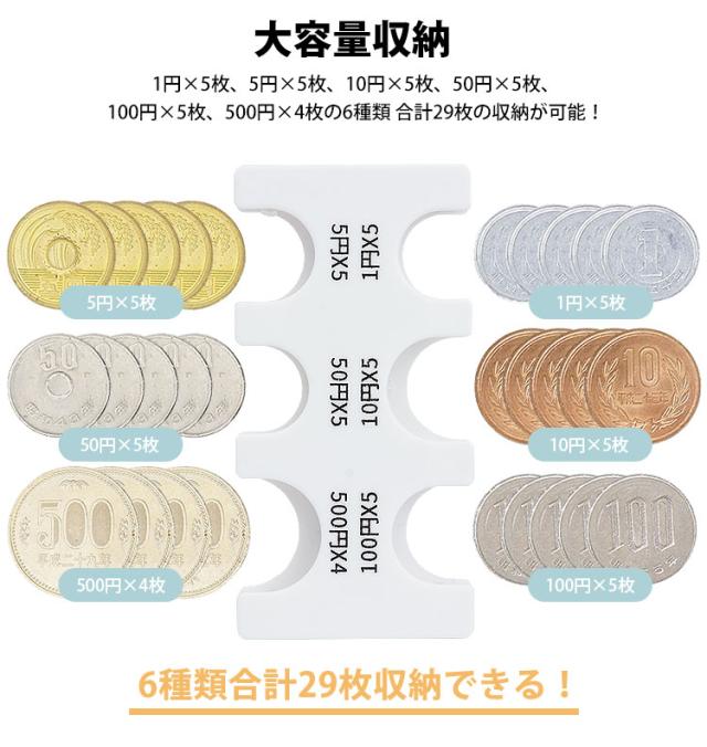 収納可能数:1円×5枚、5円×5枚、10円×5枚、50円×5枚、100円×5枚、500円×4枚