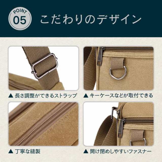 長さ調整ができるストラップ、便利なサイドポケット、丁寧な縫製、開け閉めしやすいファスナー