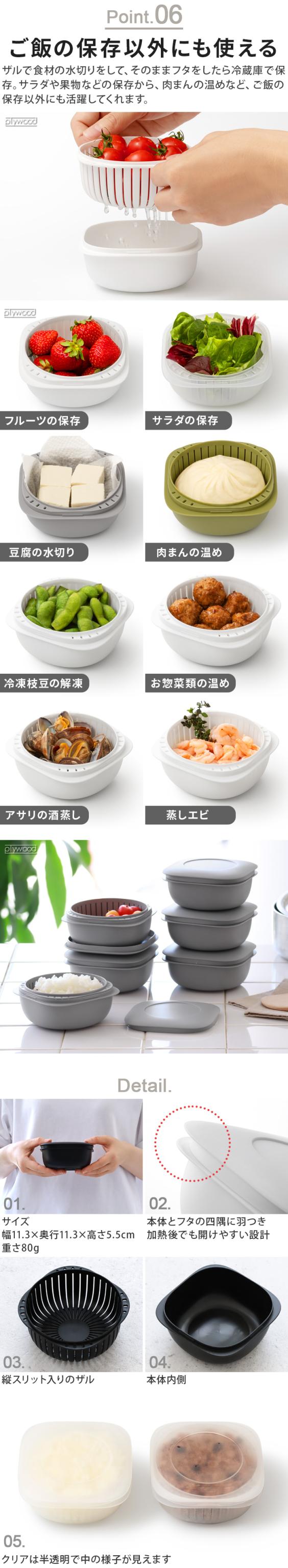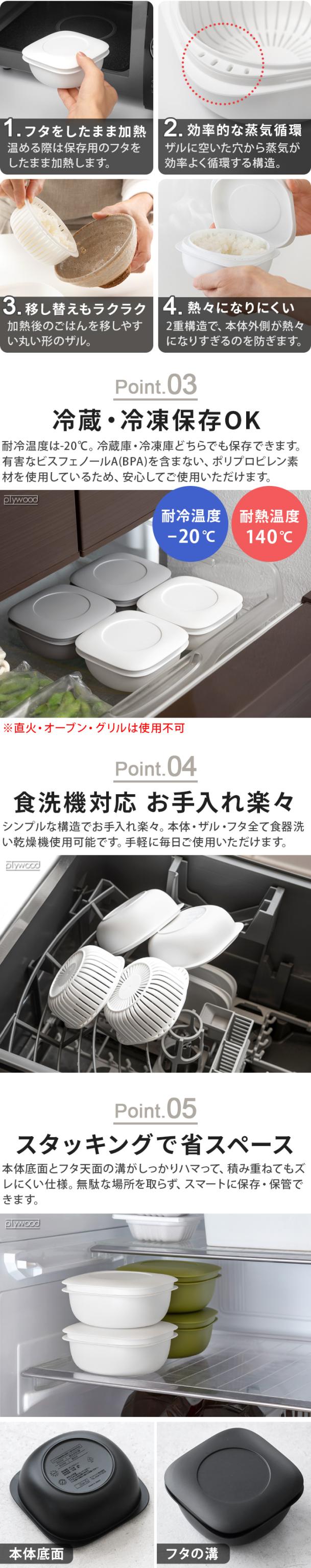 美味しく炊いたご飯を冷凍し、美味しく温められる保存容器の登場です。余分な水分が下に落ちる、ザル型2重構造で、加熱中に蒸気が循環してムラなくふっくらと仕上がります。ちょっと多めのお茶碗1膳分(160〜200g)を保存できるように設計しました。おにぎりなら2個、カレー1皿にちょうどいい容量。食洗機OK、スタッキング収納OKで使い勝手もバツグン!ご飯の冷凍保存だけではなく、蒸し料理やフルーツなどの保存にもおすすめです。