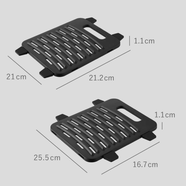 ■サイズ:幅25.5×奥行16.7×高さ1.1cm(ストッパー短辺取り付け時)、幅21×奥行21.2×高さ1.1cm(ストッパー長辺取り付け時)
