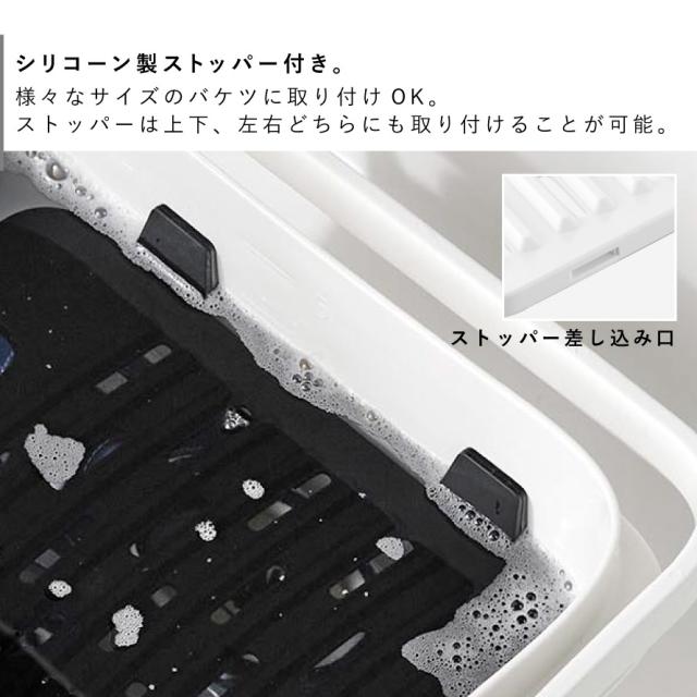 バケツに靴や衣類などを浸け置きする時に便利な浸け置き板。浸け置きしたいものが浮いてくるのを防ぐことができます。シリコーン製のストッパーを付け替えることで、様々なサイズのバケツに取り付けることができます。ストッパーは上下、左右どちらにも取り付けることができます。