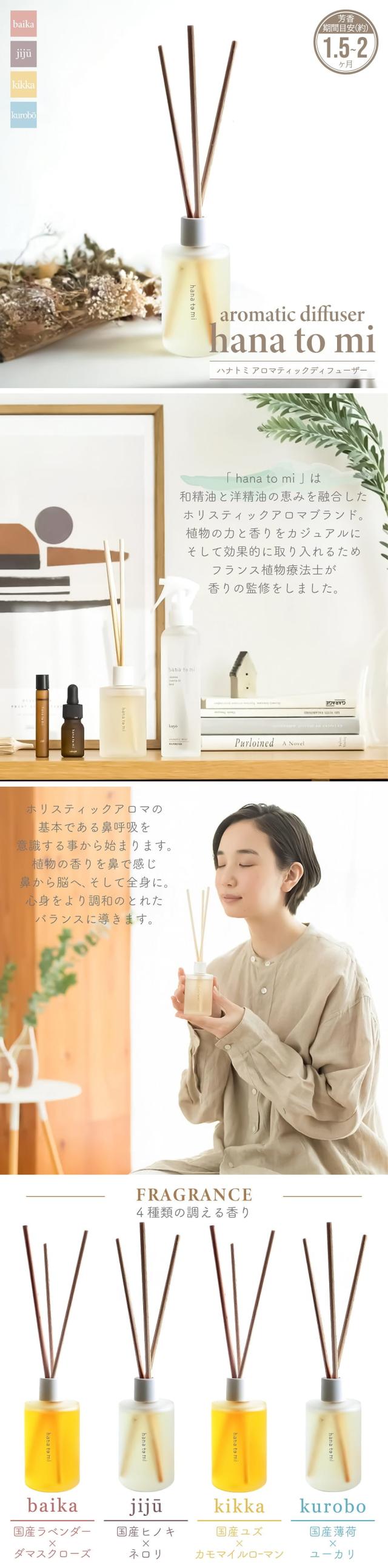 アロマ リードディフューザー hana to mi ハナトミ アロマティック ディフューザー 芳香約1.5〜2ヶ月 杉間伐材スティック 化粧箱入り FSC認証 天然精油100%の香り ホリスティック ルームフレグランス 芳香剤 インテリア