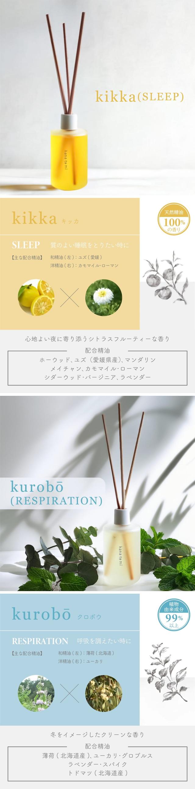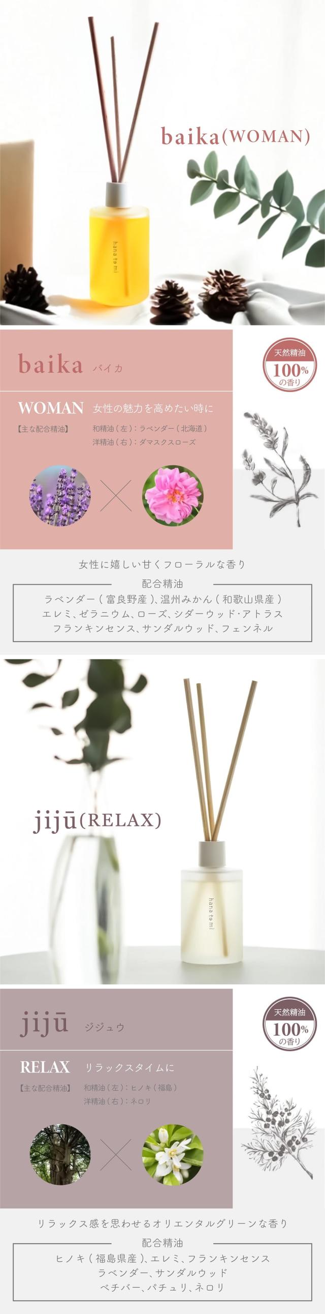 <baika> ラベンダー,温州みかん,エレミ,ゼラニウム ローズ,シダーウッド・アトラス フランキンセンス,サンダルウッド,フェンネル <jiju> ヒノキ,エレミ,ラベンダー,フランキンセンス ベチバー,サンダルウッド,パチュリ,ネロリ <kikka> ホーウッド,マンダリン,メイチャン,ユズ カモマイル・ローマン,シダーウッド・バージニア ラベンダー <kurobo> 薄荷(北海道産),ユーカリ・グロブルス, ラベンダー・スパイク,トドマツ(北海道産) |