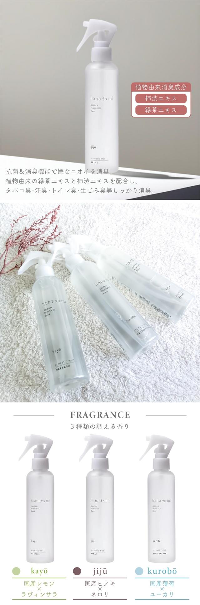 和精油と洋精油の恵みを融合したホリスティックアロマブランドのアロマミスト。 植物由来成分99%以上。抗菌&消臭機能は植物由来の緑茶エキスと柿渋エキスを配合し、タバコ臭・汗臭・トイレ臭・生ごみ臭・魚臭等をしっかり消臭、天然精油の香りでお部屋を心地よく調えます。ルームミストやファブリックミストとして使えます。