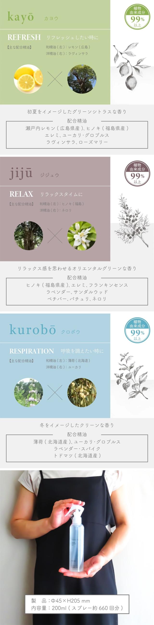 <kayo> レモン,ヒノキ,エレミ,ユーカリグロブルス,ラヴィンサラ,ローズマリー <jiju> ヒノキ,エレミ,フランキンセンス,ラベンダー,サンダルウッド,ベチバー,パチュリ,ネロリ <kurobo> 薄荷,ユーカリ・グロブルス,ラベンダー・スパイク,トドマツ |