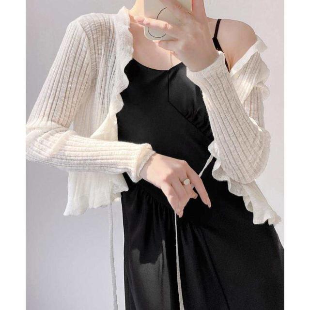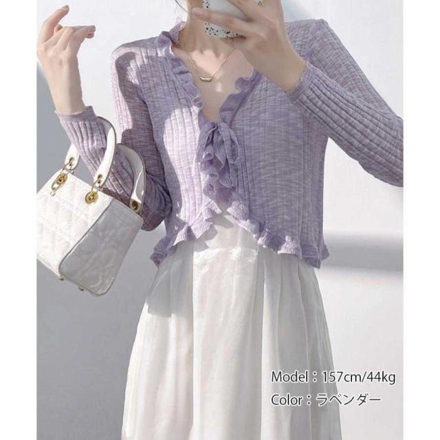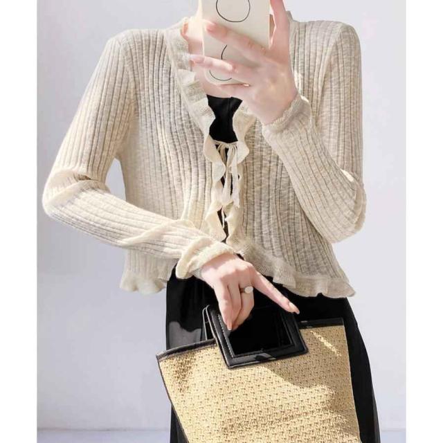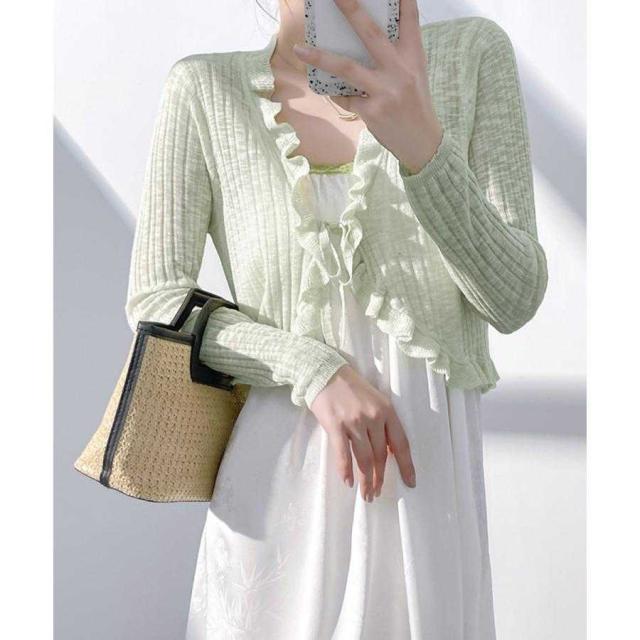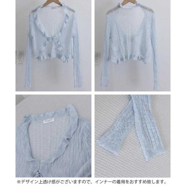 全7色展開のショート丈リブ編みフリルカーディガン。