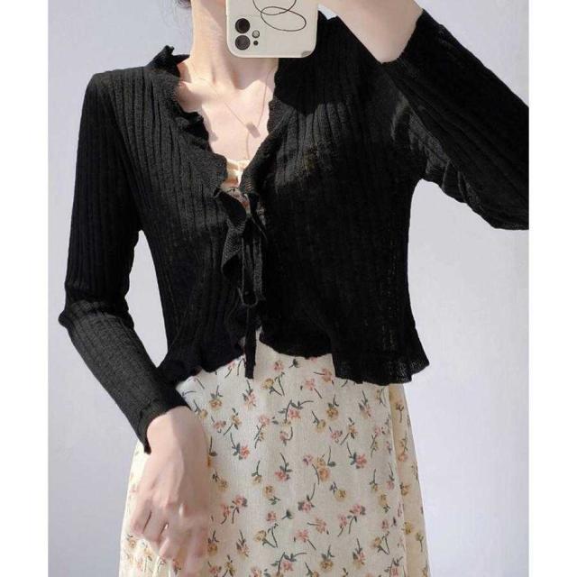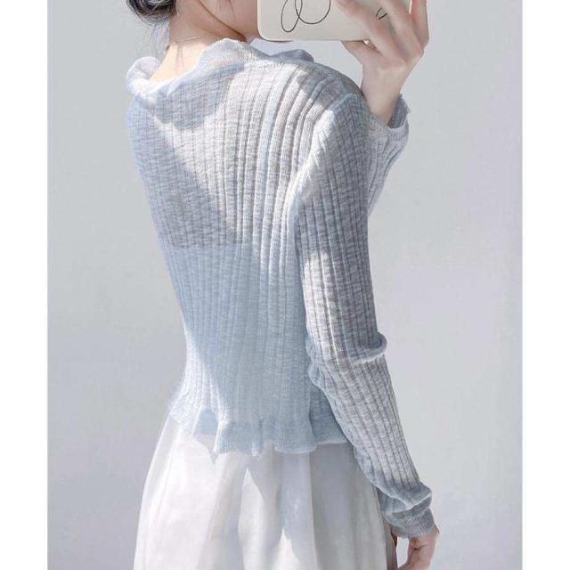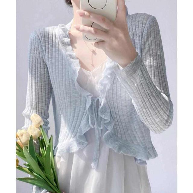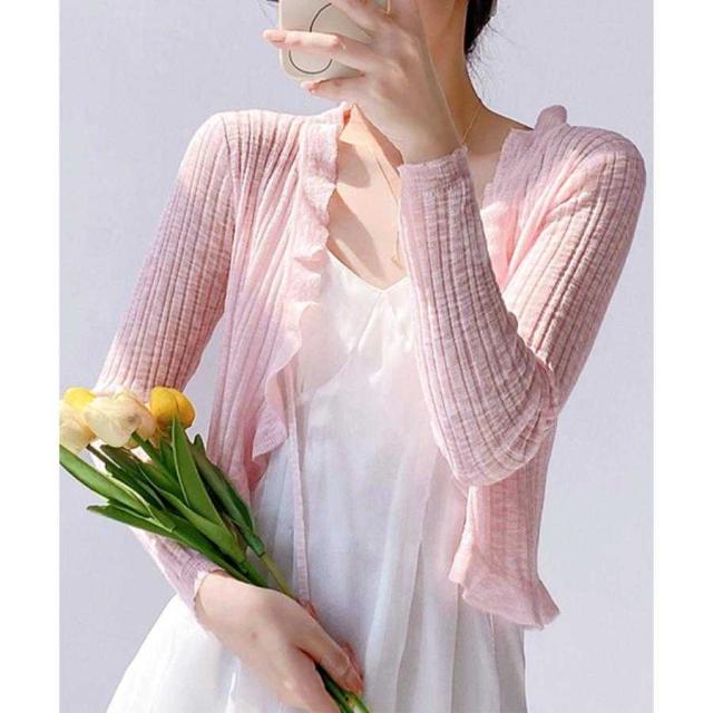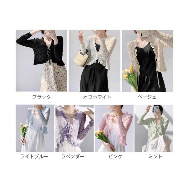 レディース ショート丈サマーニットトップス きれいめ 長袖羽織り 大人可愛いシアーカーディガン 紫外線対策 冷房対策上着