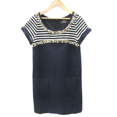 【中古】グレースコンチネンタル ワンピース ミニ丈 半袖 ビジュー パールビーズ ボーダー柄 36 S 紺 レディース