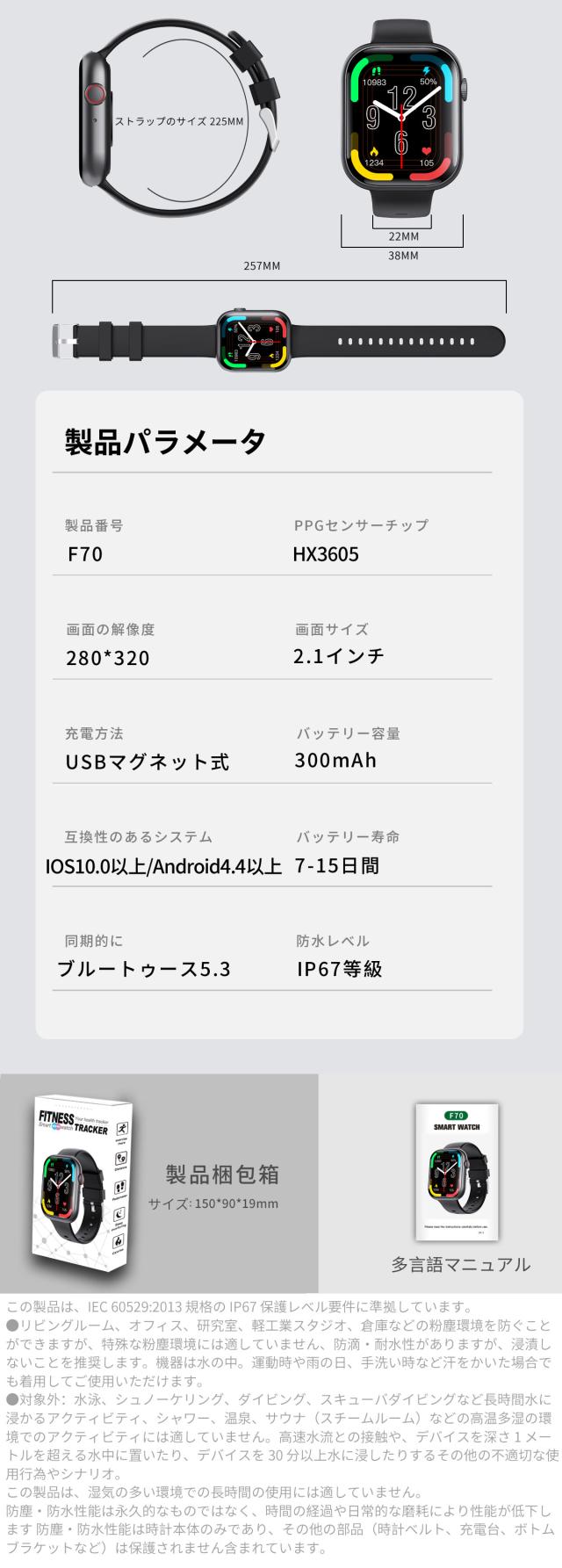 ☆閲覧いただき、誠にありがとうございます☆ 基本仕様 製品型番:F70 重量:54g ディスプレイ:2.1インチ バッテリ容量:300mAh コネクター:マグネット吸着式 ※本製品は医療機器ではなく、測定機能付きスマートウォッチであり、測定値は参考値です。 測定された数値は、専門的な医療機器の結果と比較できるものではありません。 ○使用上の注意事項○ ※改造/本来の目的以外/強い衝撃などはお控え下さい。 ※仕様は改善の為に予告なく変更する場合があります。 ※ディスプレイ画面等の環境上、写真と実際の商品の色とは多少違う場合がございます。