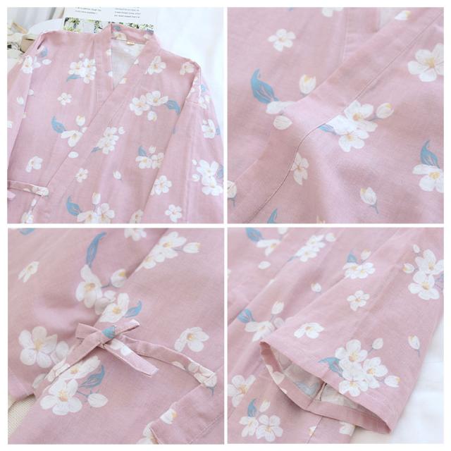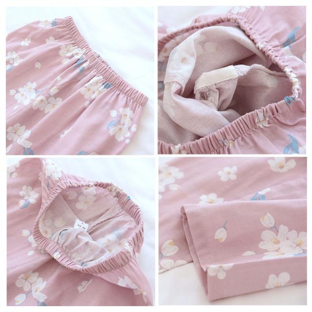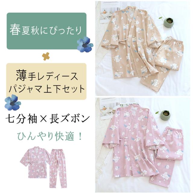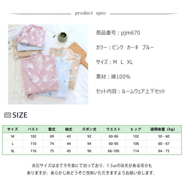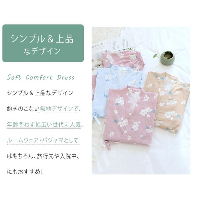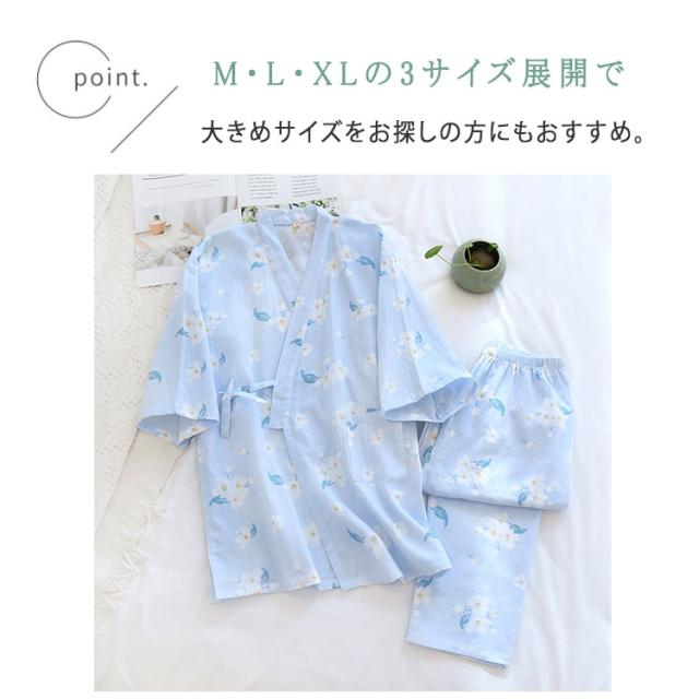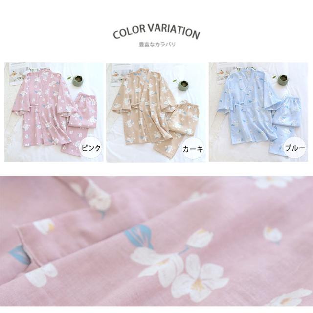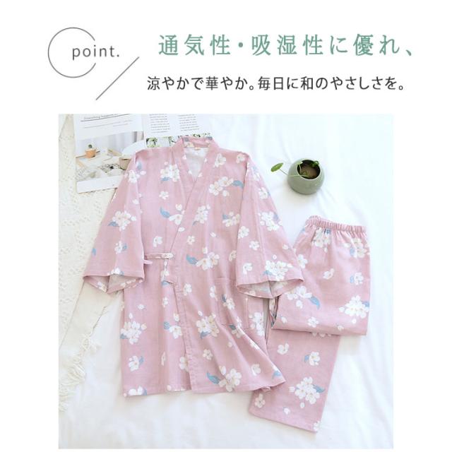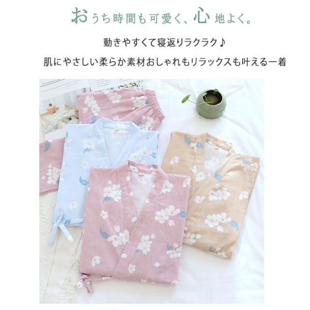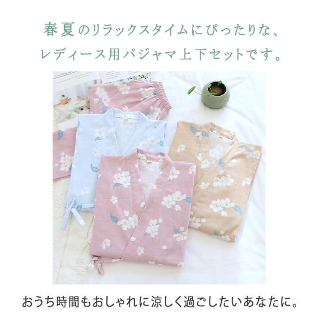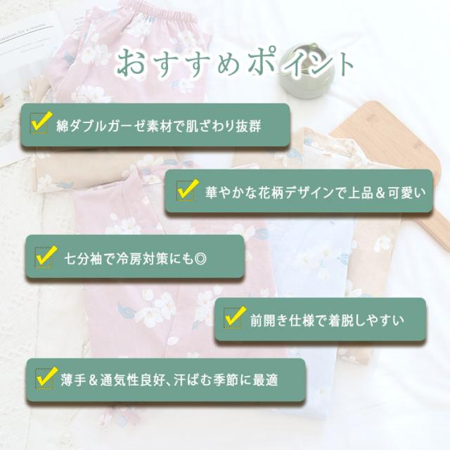商品名 | ルームウェア レディース セットアップ 甚平風 綿 ダブルガーゼ 花柄 七分袖 長ズボン 和風 パジャマ 部屋着 前開き ナイトウェア 薄手 春夏 温泉 夏祭り プール ワンマイルウェア ギフト |