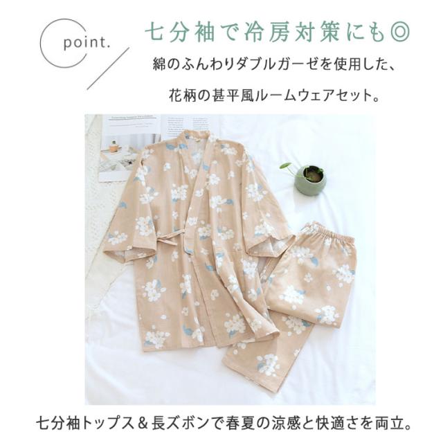 ルームウェア レディース セットアップ 甚平風 綿 ダブルガーゼ 花柄 七分袖 長ズボン 和風 パジャマ 部屋着 前開き ナイトウェア 薄手 春夏 温泉 夏祭り プール ワンマイルウェア ギフト
