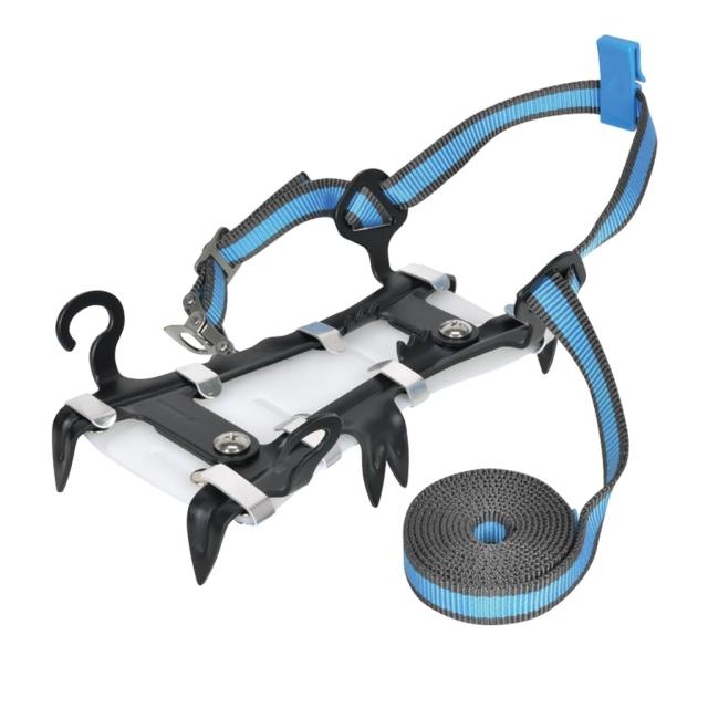 大自然の過酷な条件下で使用するアイゼンは、軽くて強靭で脱着が素早くでき、靴に良くフィットする事です。そこで従来からのリングやクサリ等の自在部品を付けることによる、バンドを通す手間や、靴の横ずれや遊びが出ると云う欠点がありました。ベルモントはアイゼン本体に直接バンド調整金具及び前部リングを引掛式に、またバンドフック装着により全て遊びのない三角形構造による様設計しました。長時間行動してもほど良く靴にフィットしつづけますのでご安心してご使用いただけます。