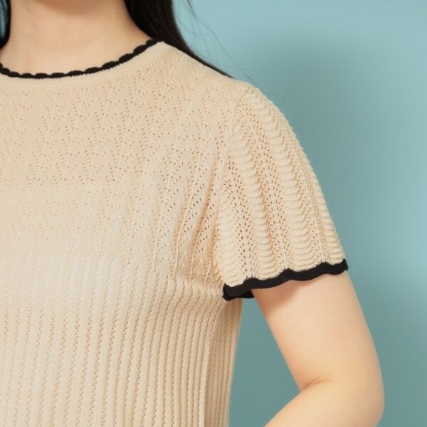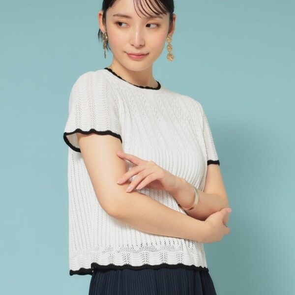 袖口と衿元、裾のスカラップがフェミニンなニットプルオーバー。