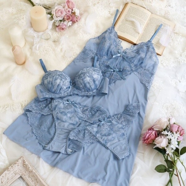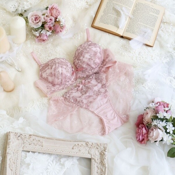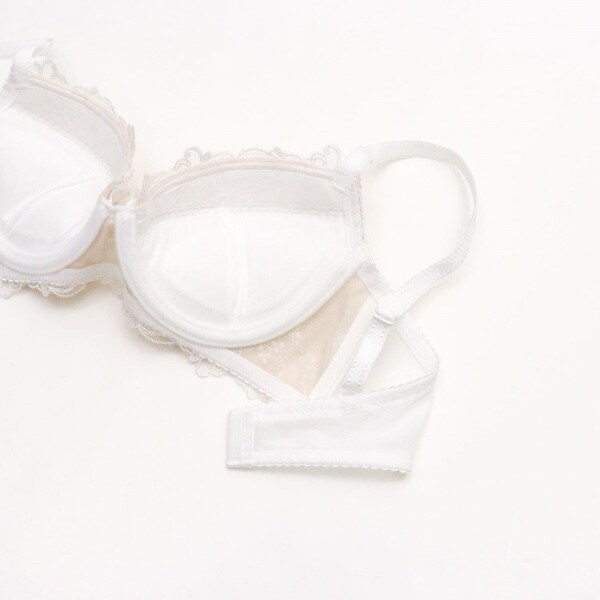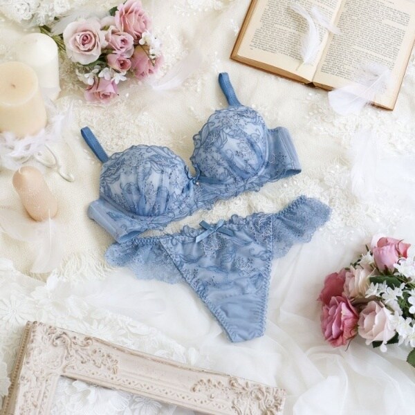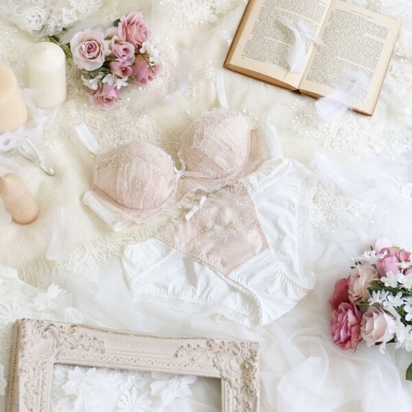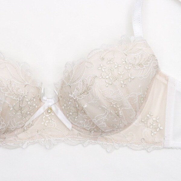 ふんわりとした羽根をイメージしたデザインと、繊細なラメ糸を上品にミックスさせたシリーズです。レース全体に細やかなステッチで小花と羽根を刺繍して、ワントーンながらも華やかさをプラス。その上からふわふわと舞い落ちたような羽根のアップリケをあしらうことで、立体感と儚さを演出しました。カップの中央には一粒の小さなストーンチャームをあしらい、レースのほのかなきらめきを美しく引き立てます。色使いもエレガントなアッシュカラーでまとめた、毎日にそっと寄り添ってくれるようなコレクションです。