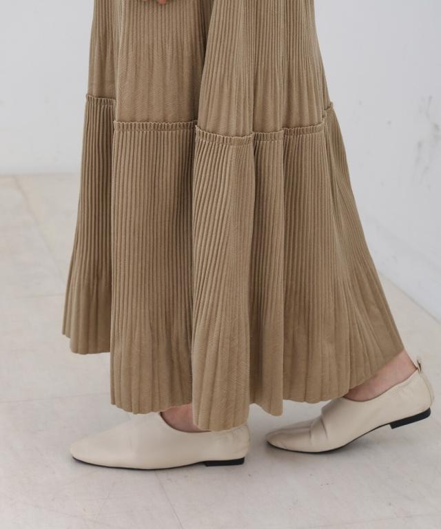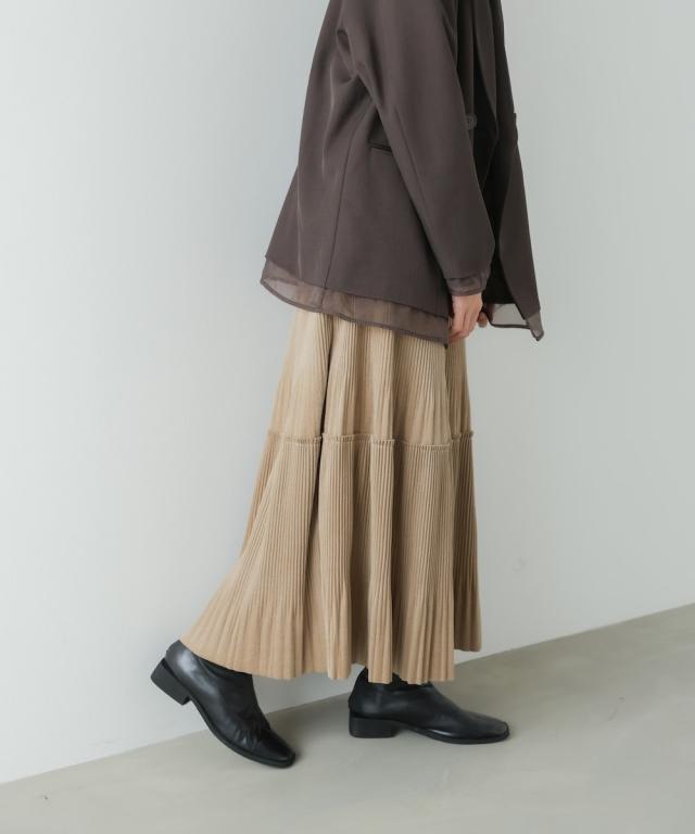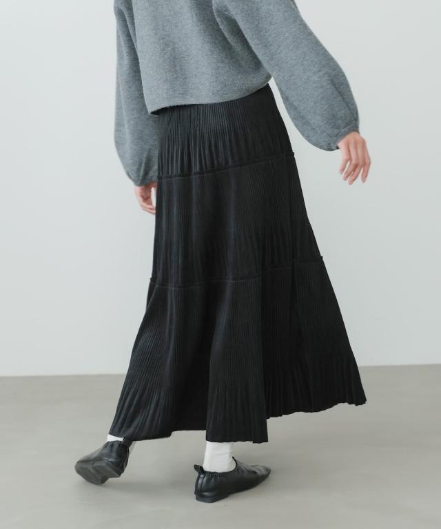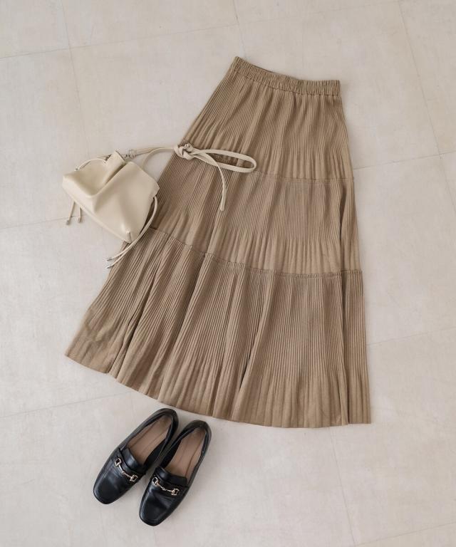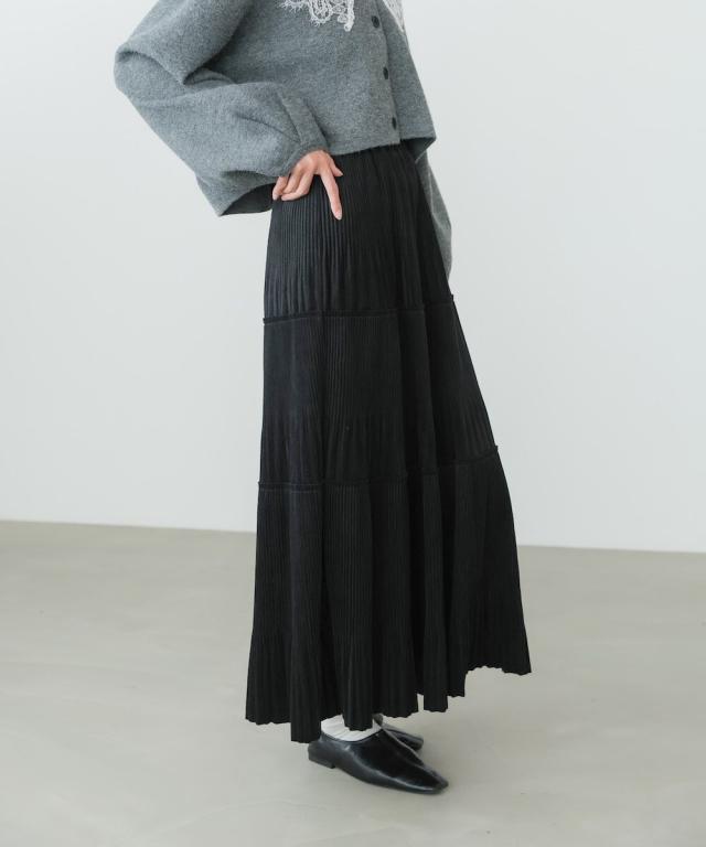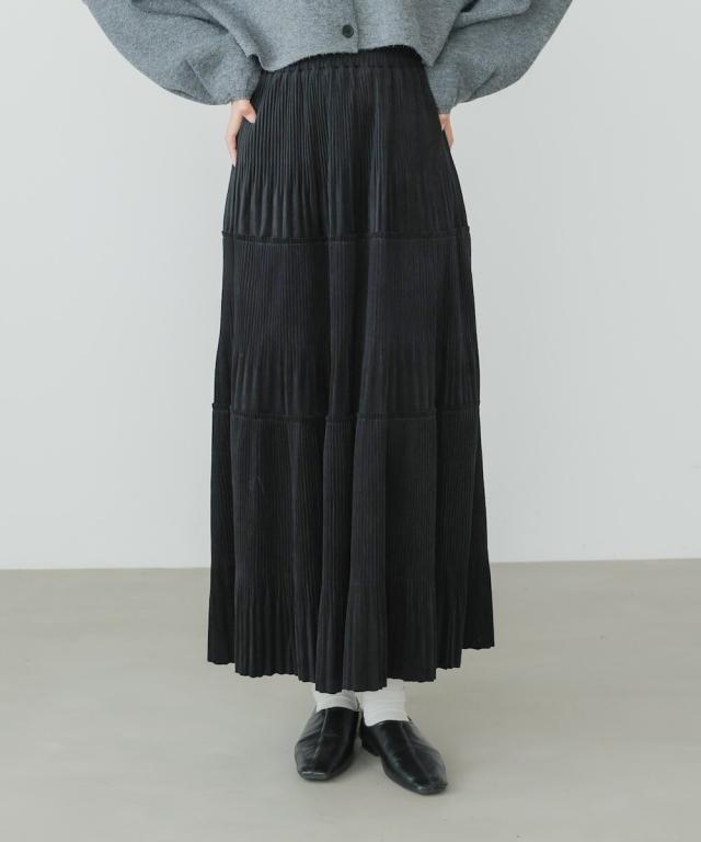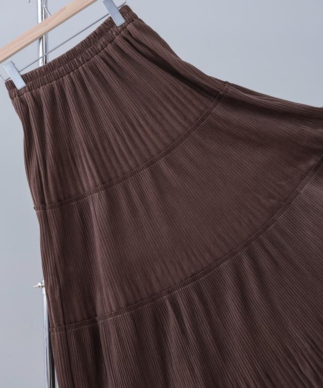 ベロアジャージー素材にプリーツを施した、3段ティアードスカート。着るだけで、程よい女らしい印象になります。上下2種類のプリーツを施しており、他とはちがうデザインになっております。腰周りはスッキリと見える分量にし、切替え部分から裾にかけて、きれいに広がるシルエットにこだわりました。裾は断ち切り仕様にして、ソフトな印象に。ウエストはゴムになっていて、ストレスのない履き心地に仕上げました。こっくりした色合いがこれからの季節にぴったりです♪立体感のある3段ティアードで、1枚で華やかさを演出できるデザインになりました。くっきりしたプリーツ加工で、動くたびに表情がかわる光沢感も魅力的◎。高級感がありながらイージーな総ゴム仕様で 気軽にお召し頂ける1枚です。
