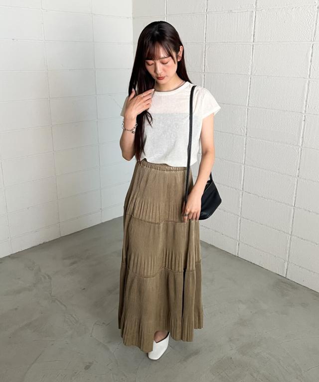 ニットを合わせてスタイルアップのコーディネートや、あえてプリントTシャツをオンして、大人カジュアルコーデがおすすめ。スカートがスッキリしているシルエットなので、ゆったりめのニットやシアースウェットなどと合わせて、バランスの良い組み合わせにするのがおすすめです。