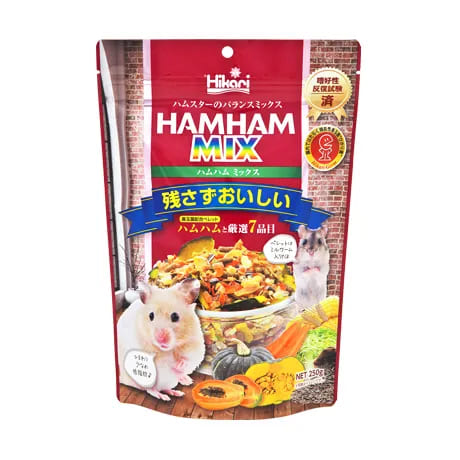 とうもろこし(日本)、大麦(日本)、ペレット(日本)、キャベツ、ニンジン、カボチャ、ヒマワリ、パパイヤ ※ペレット(ひかりハムハム) とうもろこし、小麦粉、グルテンミール、大豆ミール、アルファルファミール、米ぬか、小麦胚芽、ミールワームミール、全卵、脱脂乳、脱脂粉乳、ショ糖、乳脂肪、ビール酵母、生菌剤、かぼちゃ、ユッカ抽出物、ビタミン類(塩化コリン,E,C,B5,B2,A,B1,B6,ナイアシン,D3)、ミネラル類(Ca,P,Na,Cl,Fe,Zn,Mn,Co,Cu,I)