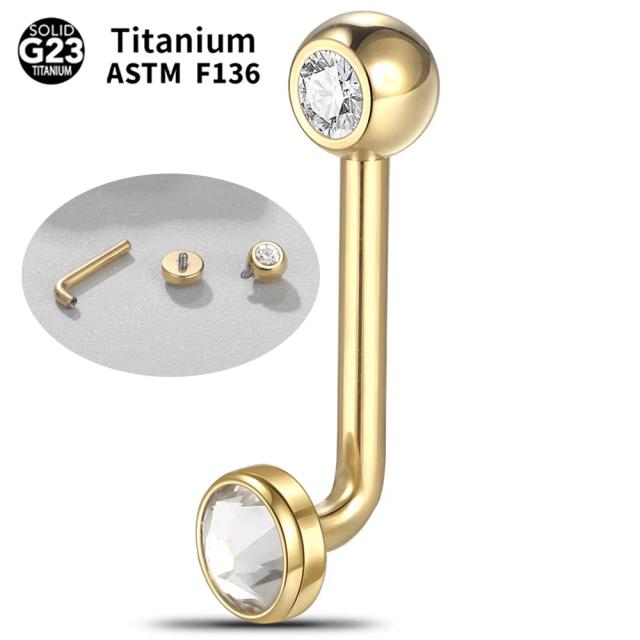 金色にゴールドメッキしたチタン(グレード23)素材のシャフトが90度にカーブし、どちらのジュエルキャッチも外せるインターナルタイプのマニアックな14ゲージのボディピアス。