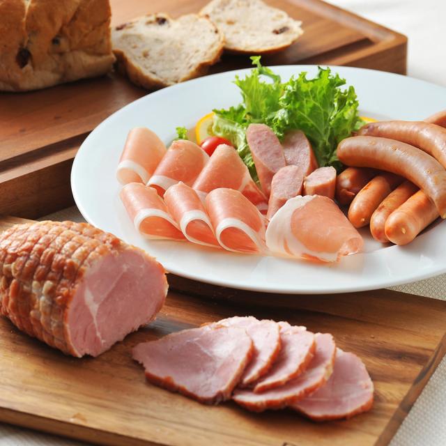 豚肉にオリジナルの調味液に漬け込み仕上げたボンレスハムと北海道産豚肉と玉ねぎを原料に、肉本来の旨味と玉ねぎの甘みをギュッと閉じ込めたポークローフ。ドイツ岩塩でまろやかに仕上げた生ハムなどが入ったセットです。