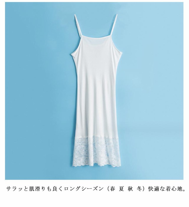| おしゃれ可愛いレース裾切り替えたキャミワンピースインナー シンプルなデザインだからトップスにひびかず肌着として、透け防止、おしゃれレイヤードなコーデとしてもOK! タイトなシルエットで体にぴったりとフィットして、女性らしいセクシーさもアピール。 滑らかで良く伸びるシルク素材で、冷感あり、静電気軽減ができるスグレモノ♪ サラッと肌滑りも良くロングシーズン(春 夏 秋 冬)快適な着心地。 シンプル無地だからドレスやワンピースのインナーとして大活躍間違いなしです! | |