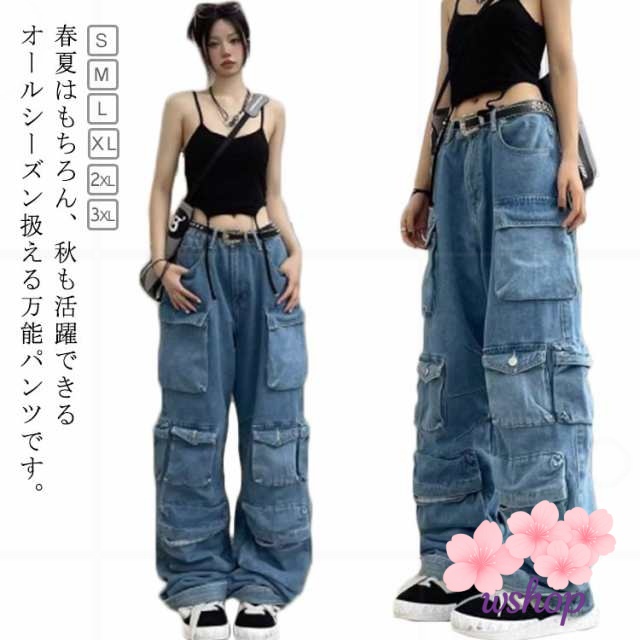 即納OK ランキング常連 体型カバー かっこいい ダンスパンツ 通勤 ヒップホップ ワイドパンツ ロングパンツ ダンス衣装 普段着 【wshop】多ポケット デニム ゆったり ガウチョパンツ ボ カジュアル ハイウエスト 大きいサイズ カーゴパンツ レディース 今だけ限定