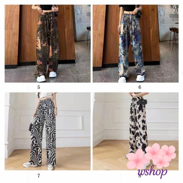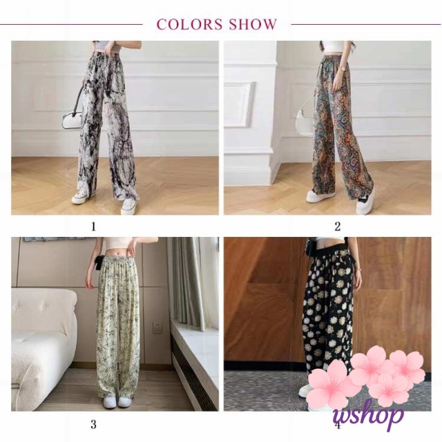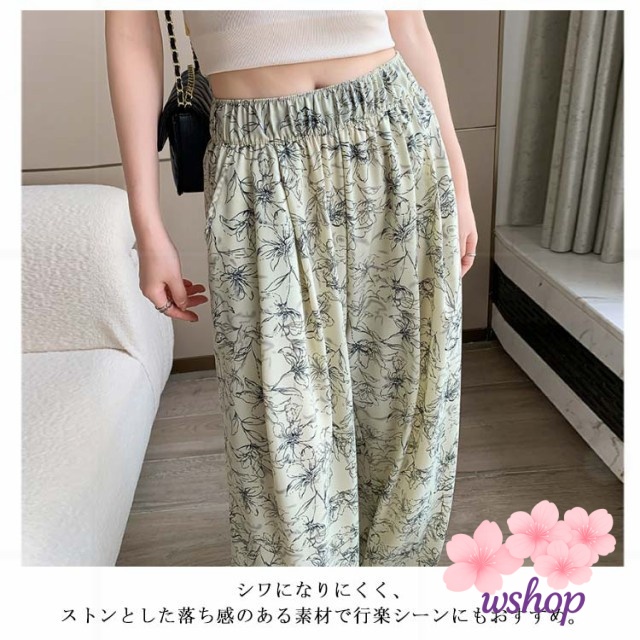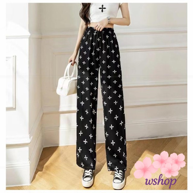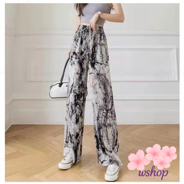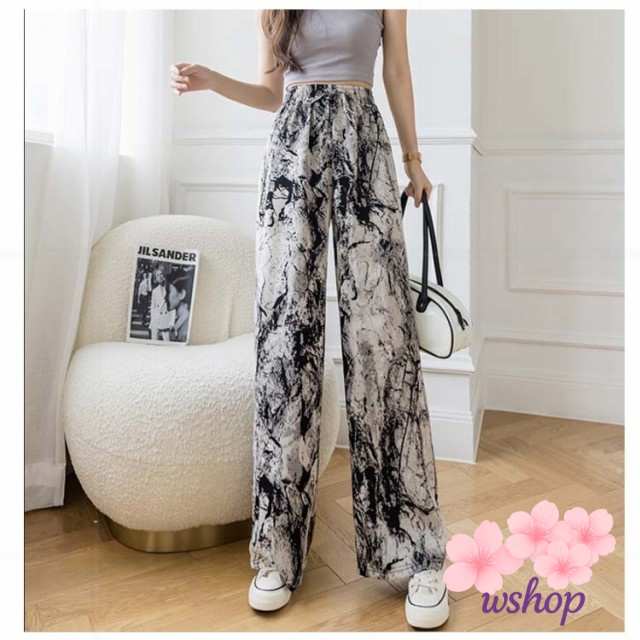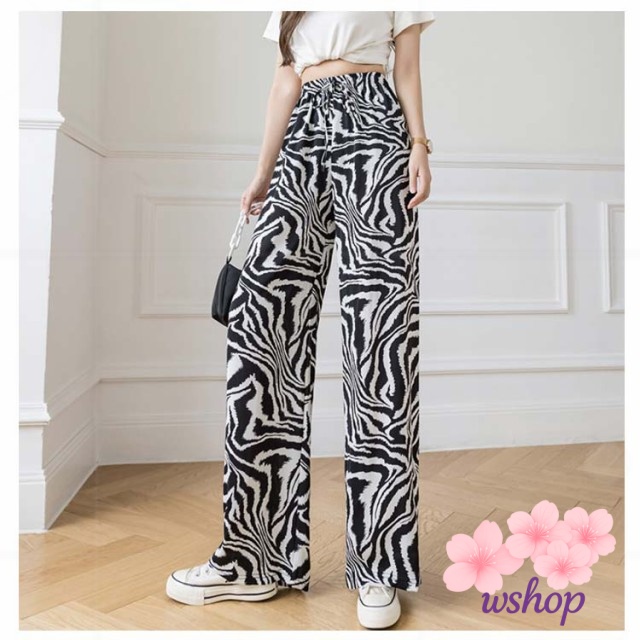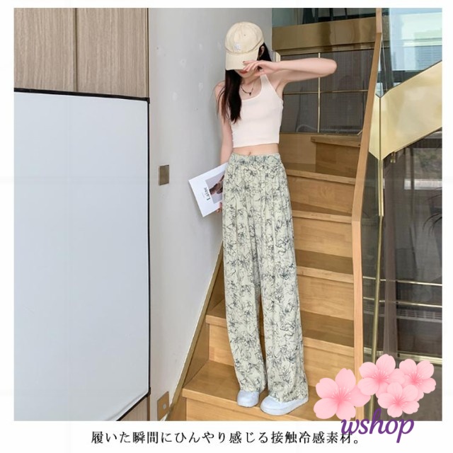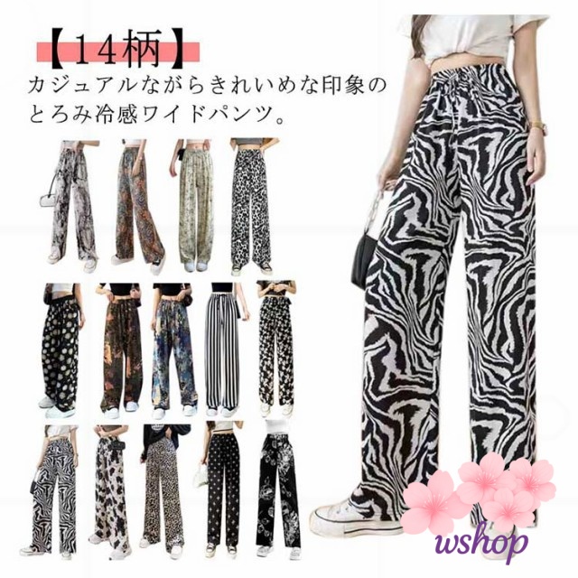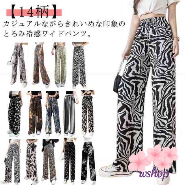 【wshop】涼感 夏 リラックス ゼブラ柄 部屋着 ハイウエスト パンツ 接触冷感 落ち感 カジュアル ロング ルームウェア アイス ワイド 冷感 ゴムウエスト シルク 花柄 イージーパンツ レディース 薄手 ワイドパンツ ストレッチ 着?せ ヒョウ柄 体型カバー 総柄