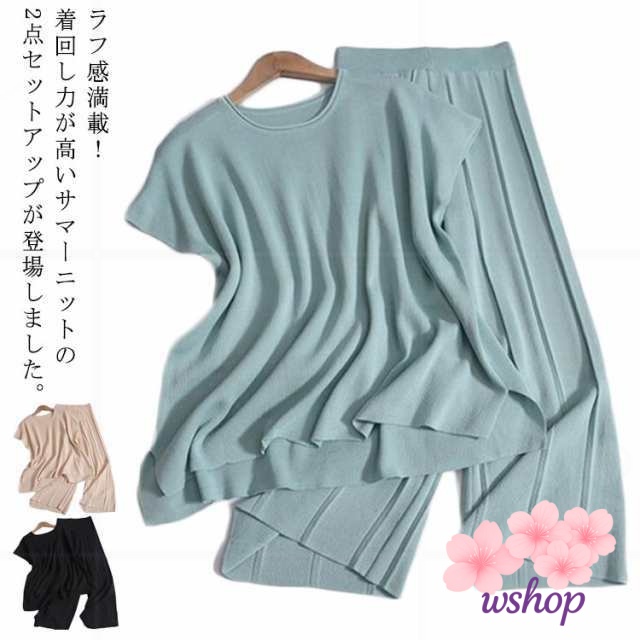 即納OK SNS話題 上下セット カットソー ゆったり 半袖 20代 ワイドパンツ ニットセットアップ パンツスーツ 30代 【wshop】レディース Tシャツ サマーニット 夏用 2点セット ドルマン 体型カバー フレンチスリーブ 着痩せ リブパンツ 通勤OL 今だけ限定