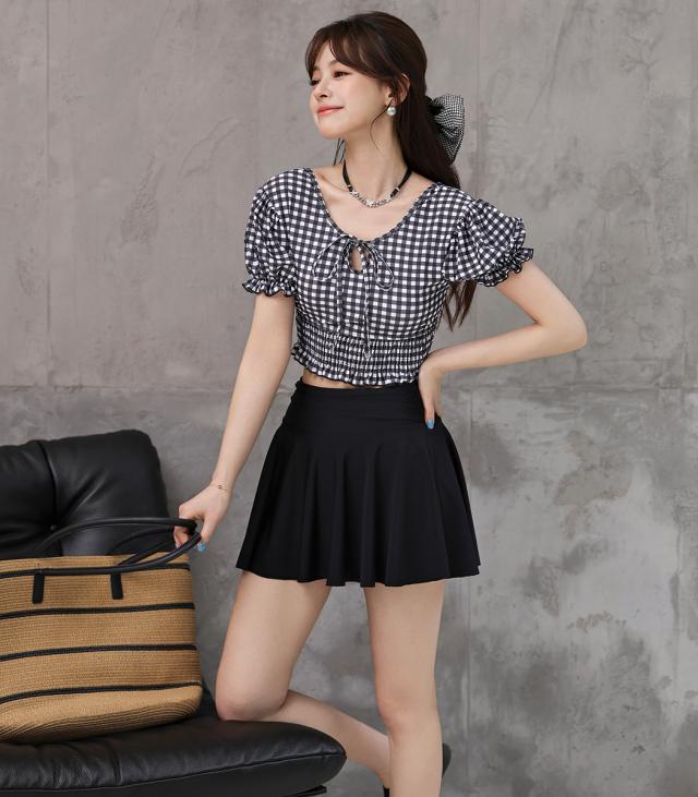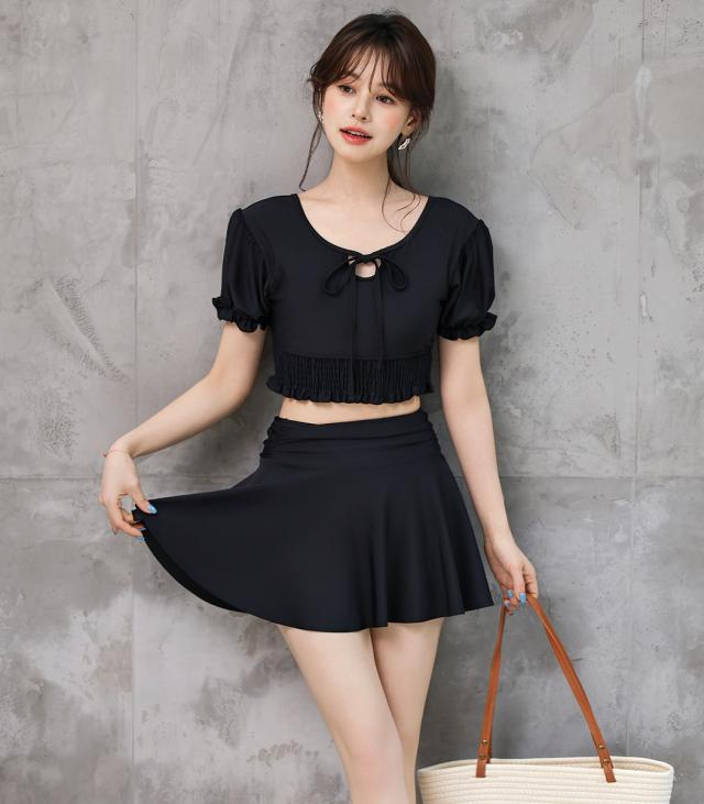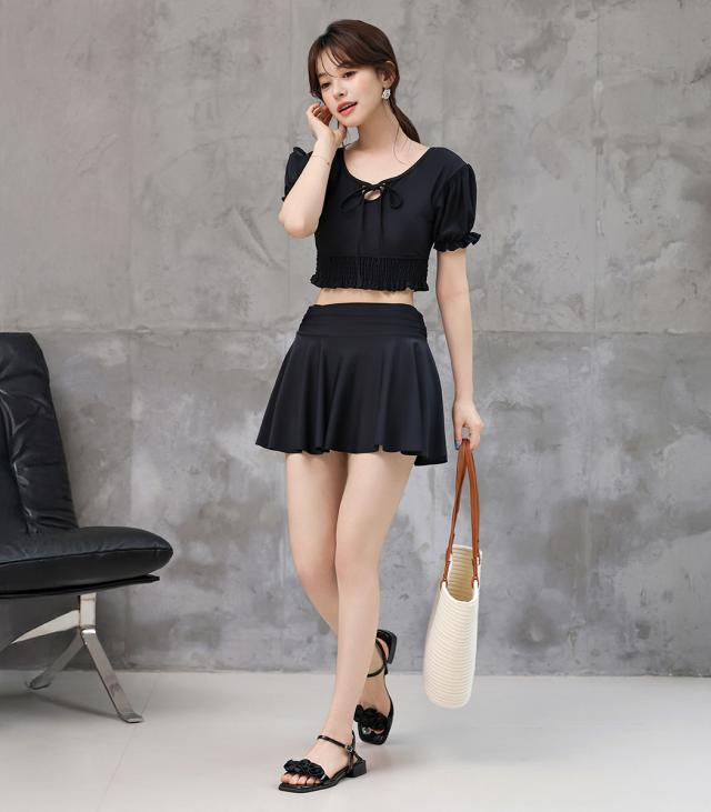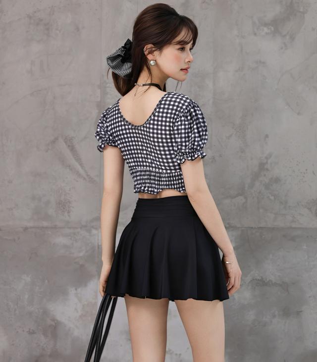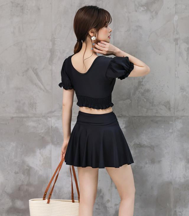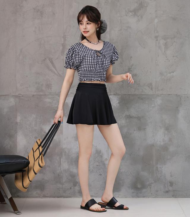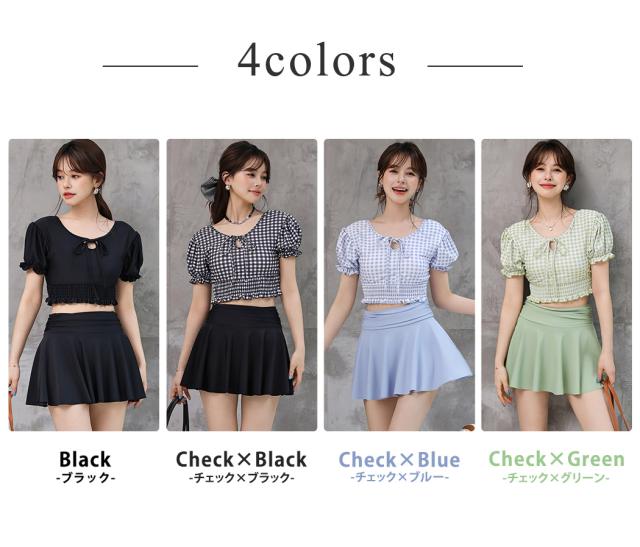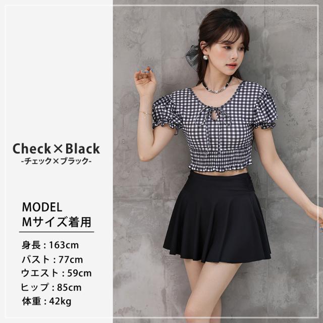 夏新作 水着 レディース 体型カバー 3点セット セパレート クロップド丈 ブラトップス スカート ショーツ チェック 袖あり パフスリーブ 洋服見え フリル リボン ノンワイヤー パッド付き 二の腕 ウエスト ヒップ お尻 太もも 脚 カバーアップ 黒