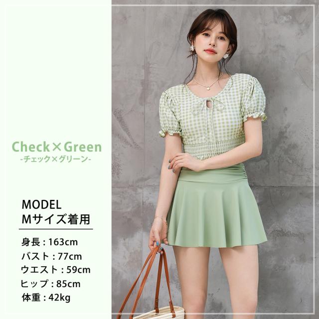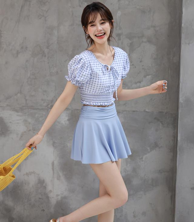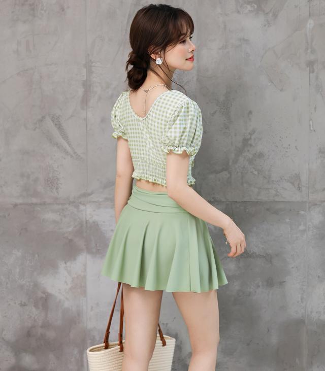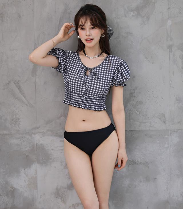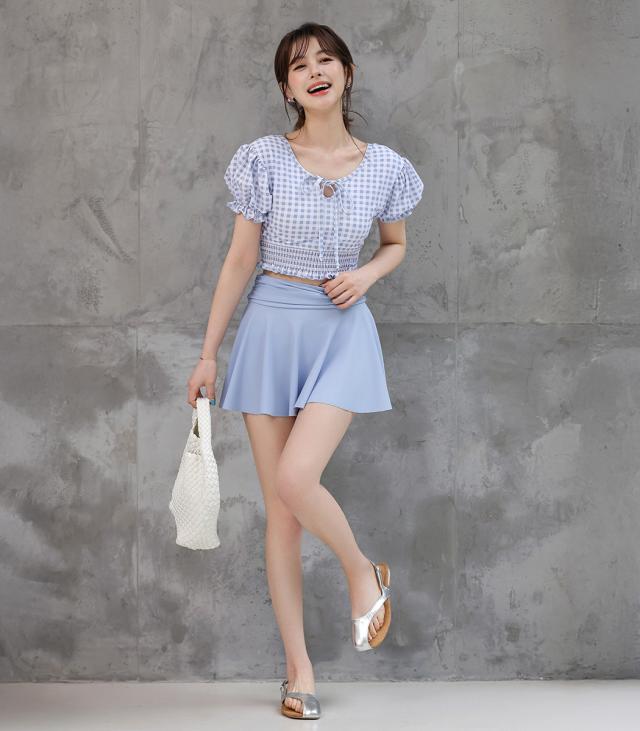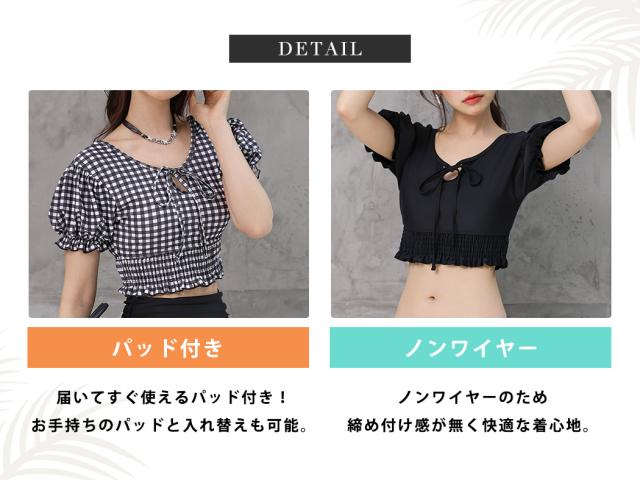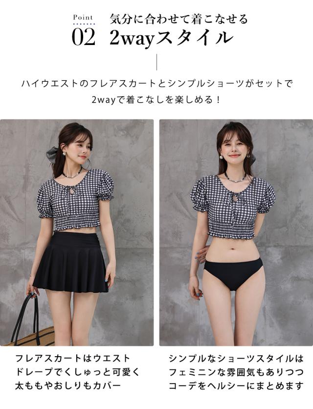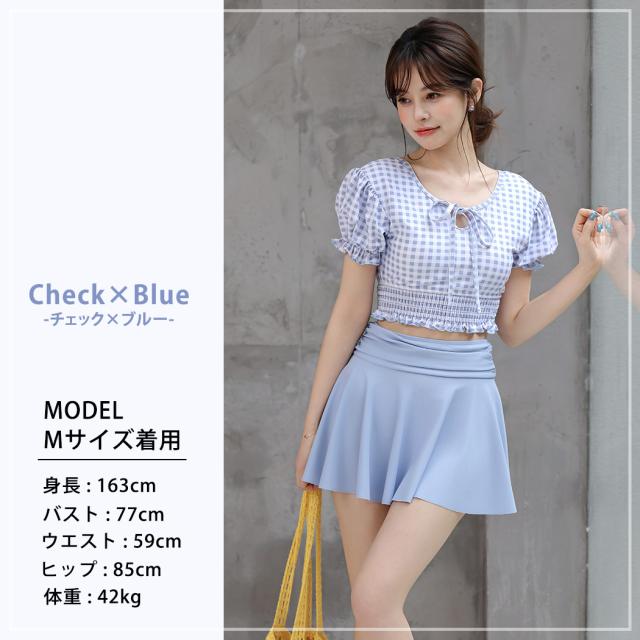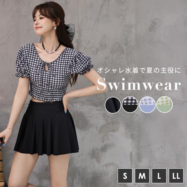 夏新作 水着 レディース 体型カバー 3点セット セパレート クロップド丈 ブラトップス スカート ショーツ チェック 袖あり パフスリーブ 洋服見え フリル リボン ノンワイヤー パッド付き 二の腕 ウエスト ヒップ お尻 太もも 脚 カバーアップ 黒