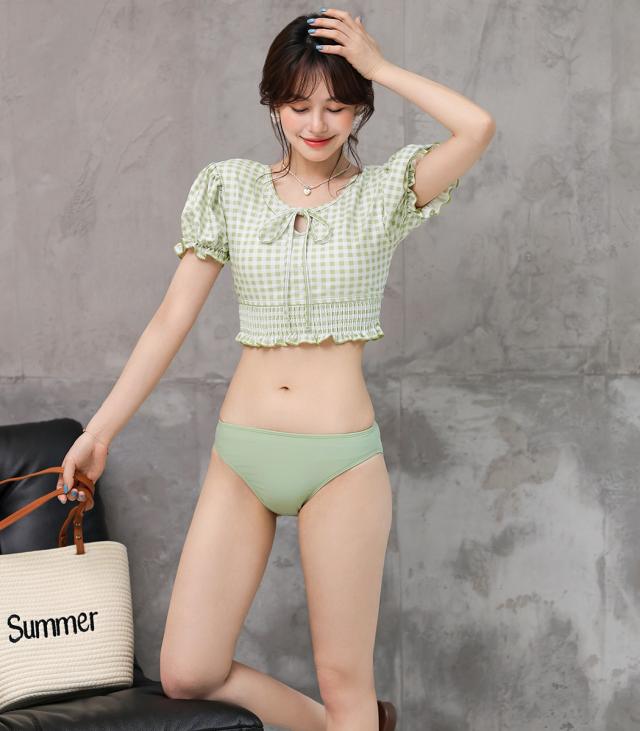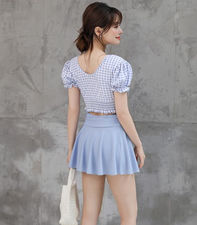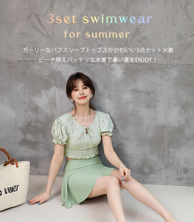 ガーリーなパフスリーブトップスがかわいい3点セット水着