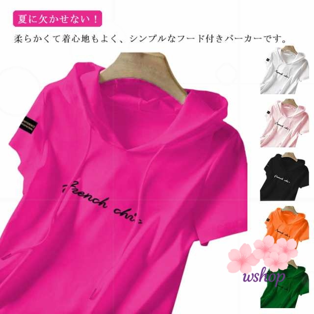 【wshop】カットソー 大きいサイズ 夏 パーカー レディース パーカー トップス フード付きtシャツ ロゴ シンプル フード プリント フーディー プルオーバー カジュアル 送料無料 薄手 Tシャツ 春 半袖 テーシャツ tシャツ