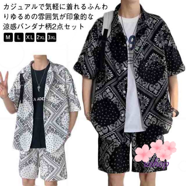 話題商品 SNS話題 【wshop】ゆったり 速乾 プリント 原宿系 夏 ペイズリー メンズ 海 薄手 セットアップ 和柄 冷感 半袖 大きいサイズ 2点セット ストリート 接触冷感 おしゃれ 涼感 アロハシャツ バンダナ柄 カジュアルシャツ 送料無料