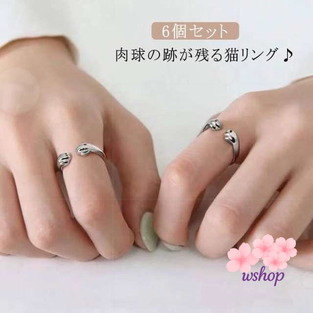 【6個セット】 指輪 肉球 レディース リング 猫の手 肉球 リング 猫 ねこ 犬 指輪 猫モチーフ かわいい 猫グッズ 猫アクセサリー 大人 おしゃれ フリーサイズ サイズ調整 重ね付け 新作 韓国 リング シルバー 銀 猫好き ネコ 誕生日 プレゼント ギフト 送料無料
