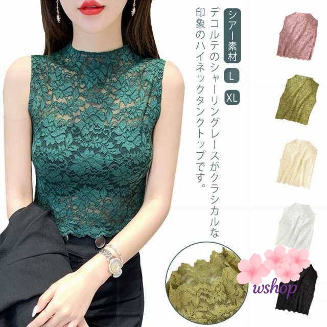 【wshop】総レース スカラップレース カットソー 夏 春 タンクトップ トップス ノースリーブ Tシャツ レディース トップス レースインナー シアー素材 プチハイネック ハイネック ブラウス レース タンクトップ