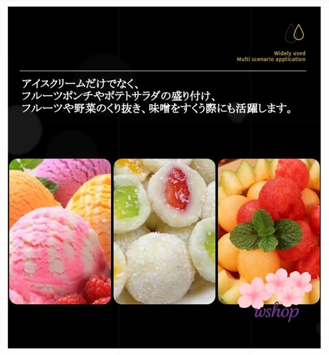 | アイスクリームをお店のように丸く盛り付け出来るアイスクリームスクープ。 スクープの幅が広いのですくいやすい。 凍って硬くなったアイスも差し込みやすい形状。熱伝導ハンドルで、握りやすく、すくいやすく 凍ったアイスを簡単にすくえます。※小さなお子さんがご使用する場合、冷凍庫から出されてしばらく時間をおいてからご使用下さい。 フィット感の良いハンドルで、握りやすい。 接続部分が無いので、断裂、劣化などの心配がありません。 アイスクリームだけでなく、フルーツポンチやポテトサラダの盛り付け、フルーツや野菜のくり抜き、味噌をすくう際にも活躍します。 | |